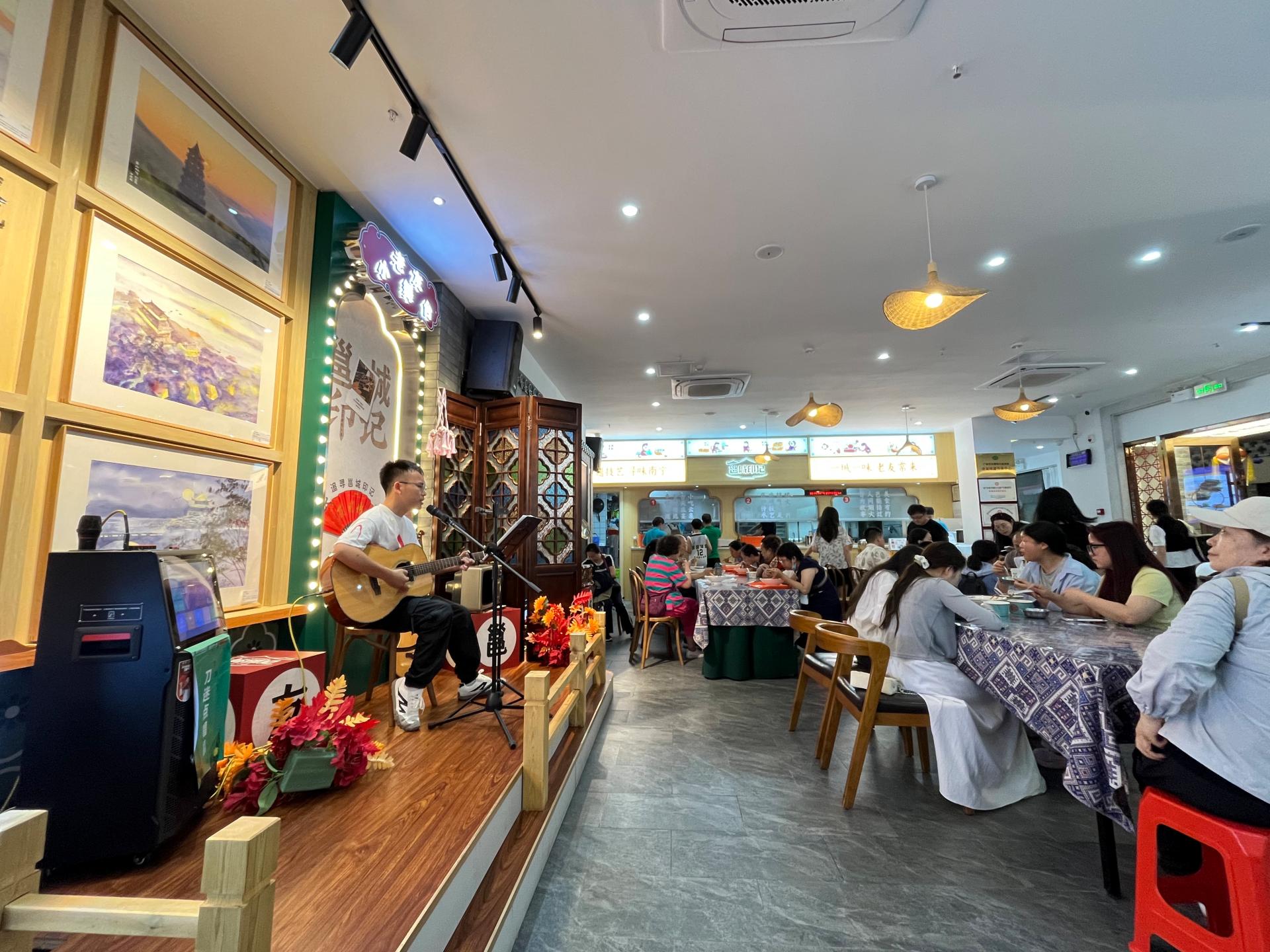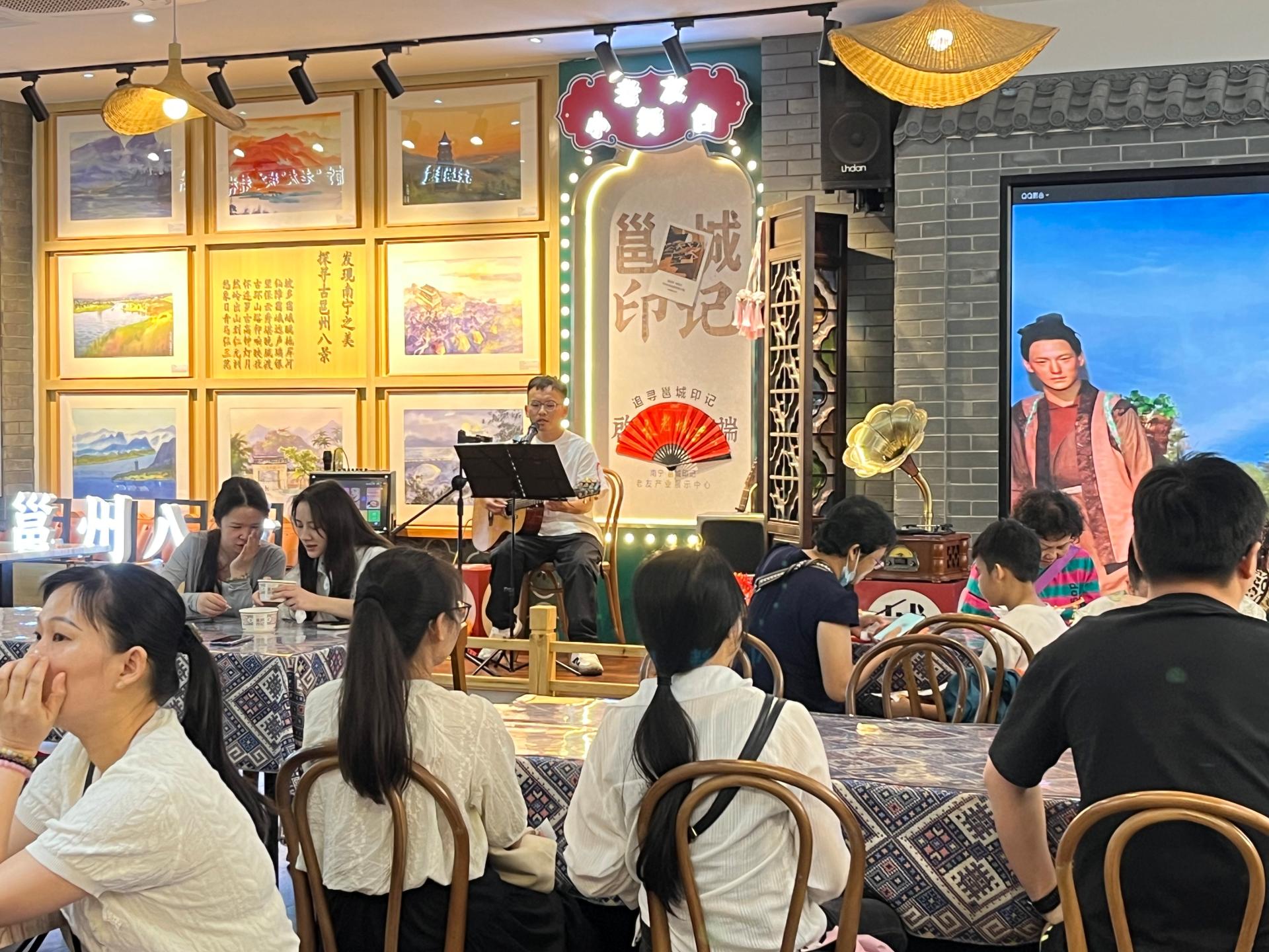 南宁文旅集团将观演活动与文旅资源深度绑定,在旗下品牌邕城印记店内外设置2个歌迷打卡点,店外全天设置应援合影美陈,同时放置“刀迷点唱机”让歌迷现场点唱刀郎歌曲,加热互动氛围;演唱会期间,店内连续两晚开展“邕城老友小舞台”刀郎金曲专场演出,由“银河老友”乐队弹唱刀郎经典歌曲,到店顾客可以听歌打卡、点歌互动和大合唱,增加观演乐趣和集体互动性,吸引过万人次到店打卡、用餐、消费。