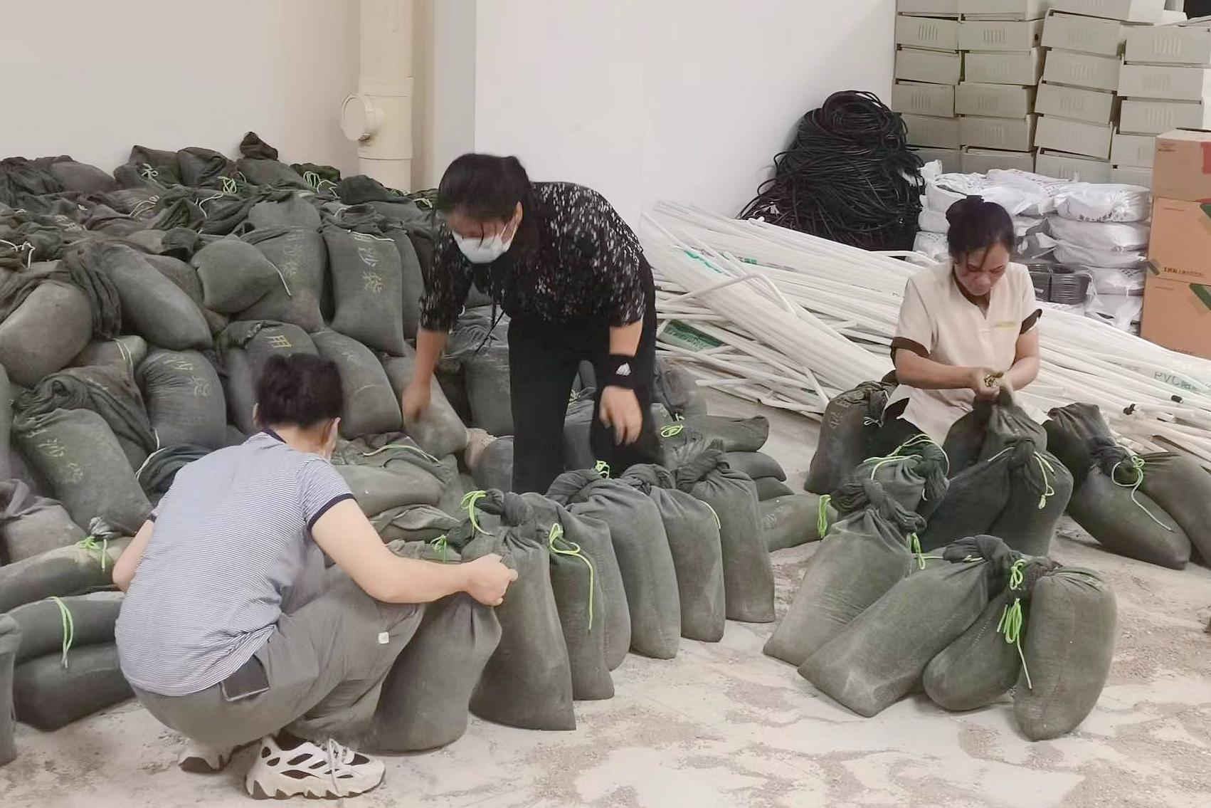 派出支援“力量”在捆扎清点沙袋
