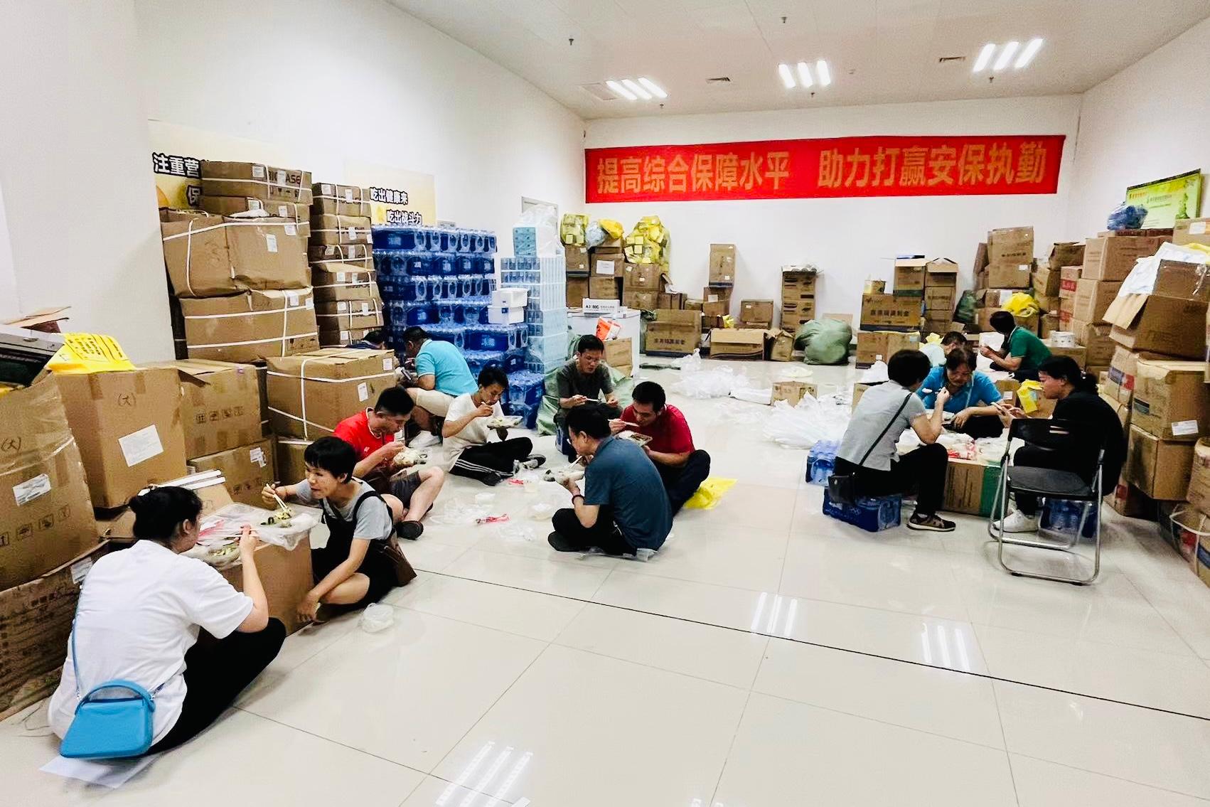 党员职工默契配合正有序搬运帐篷
