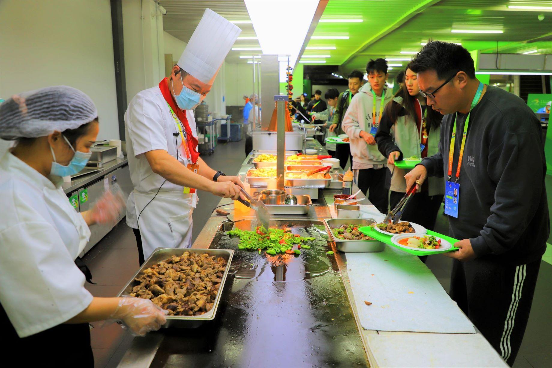 在就餐服务方面,运动员餐厅可容纳3850人同时就餐,提供早餐、中餐、晚餐、夜餐等日常餐食,人性化开设生日餐、病号餐,可向运动员提供外带常温餐包等。针对全国各地运动队伍的口味差异,餐厅在赛事期间共准备8大菜系900多道菜(含饮品、冰激凌等),风味多样,5天一换,保证菜品每天不重样。运动员餐厅中还特别开设了具有广西风味的美食档口,桂林米粉、老友粉、恭城油茶等地方美食深受运动员、教练员的好评。
