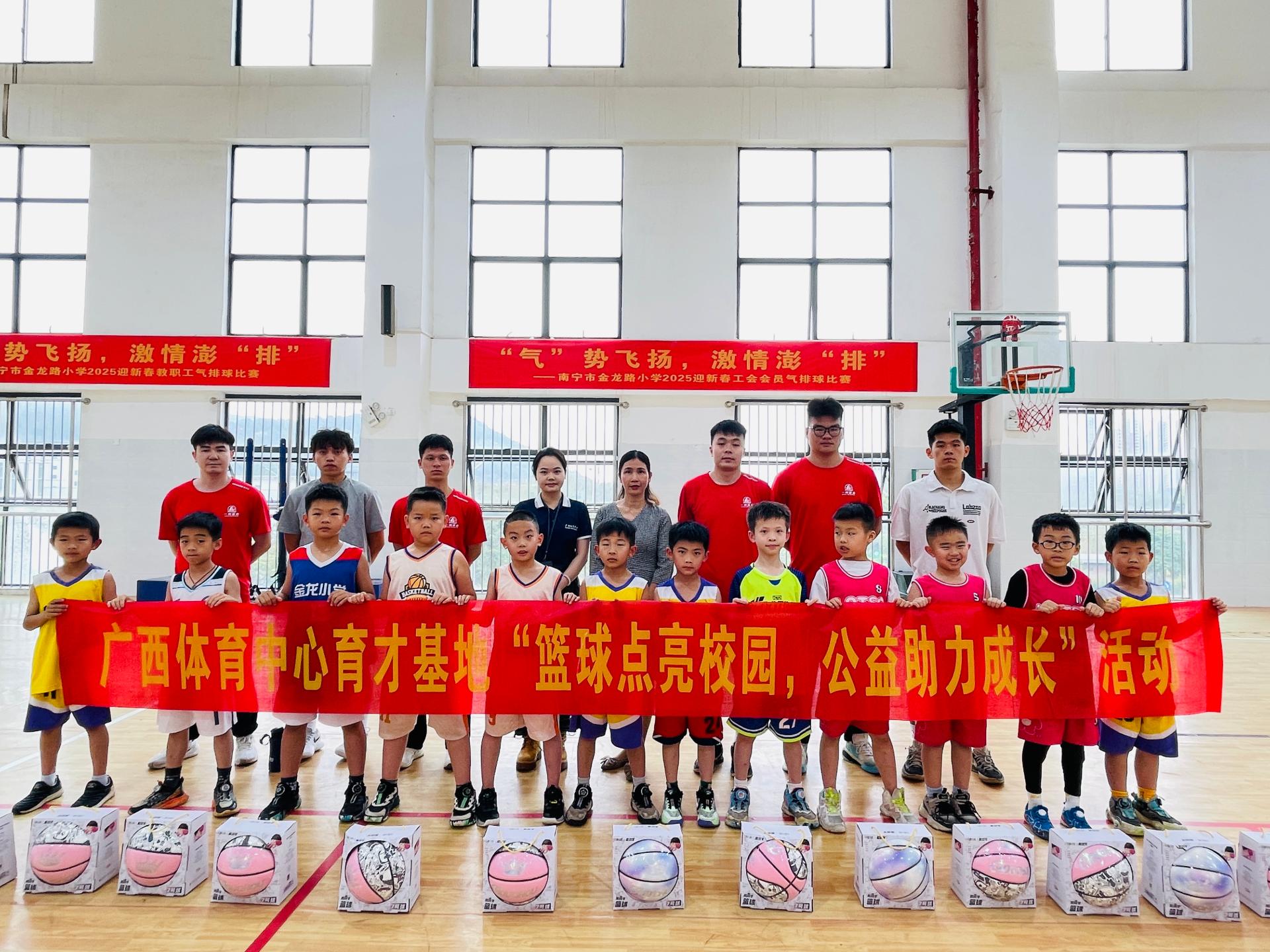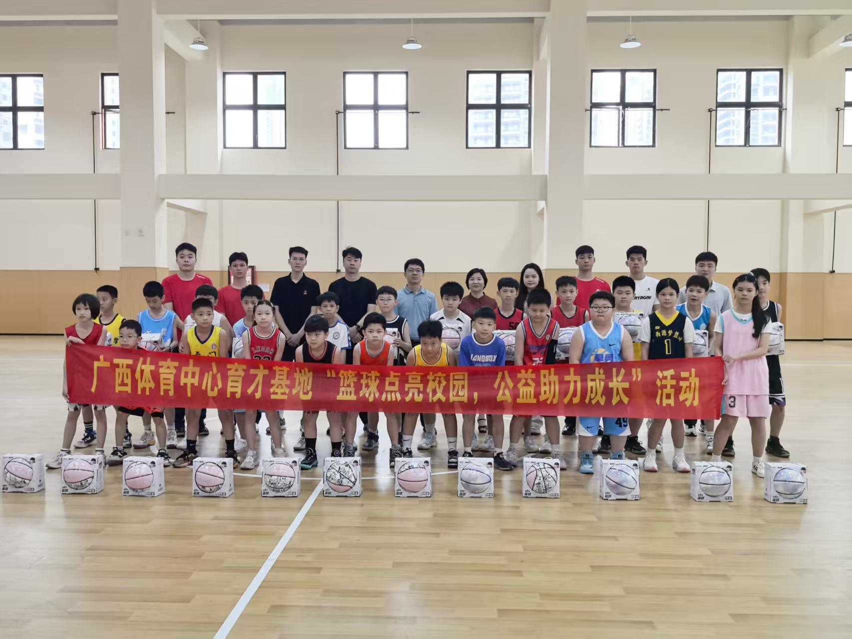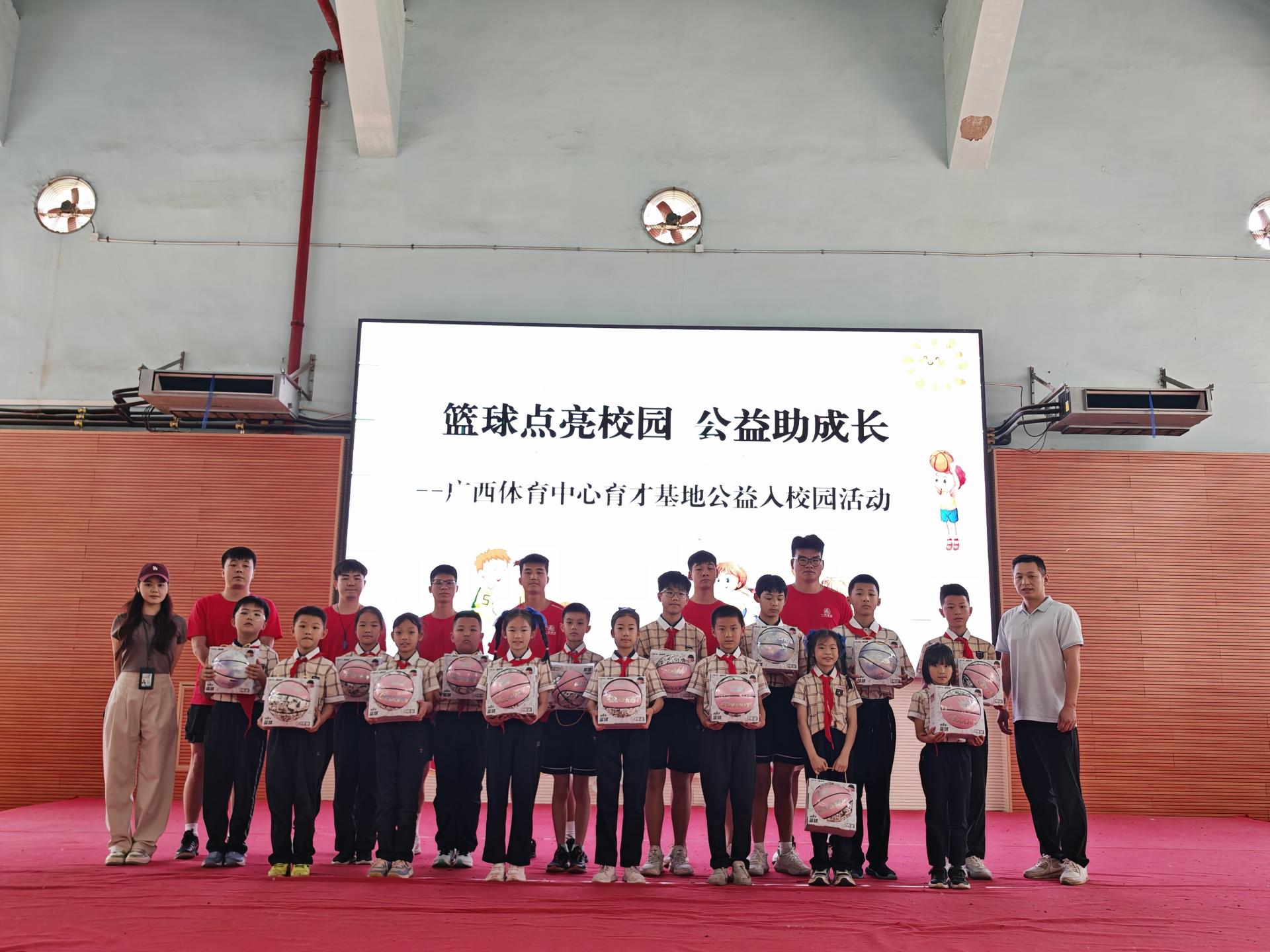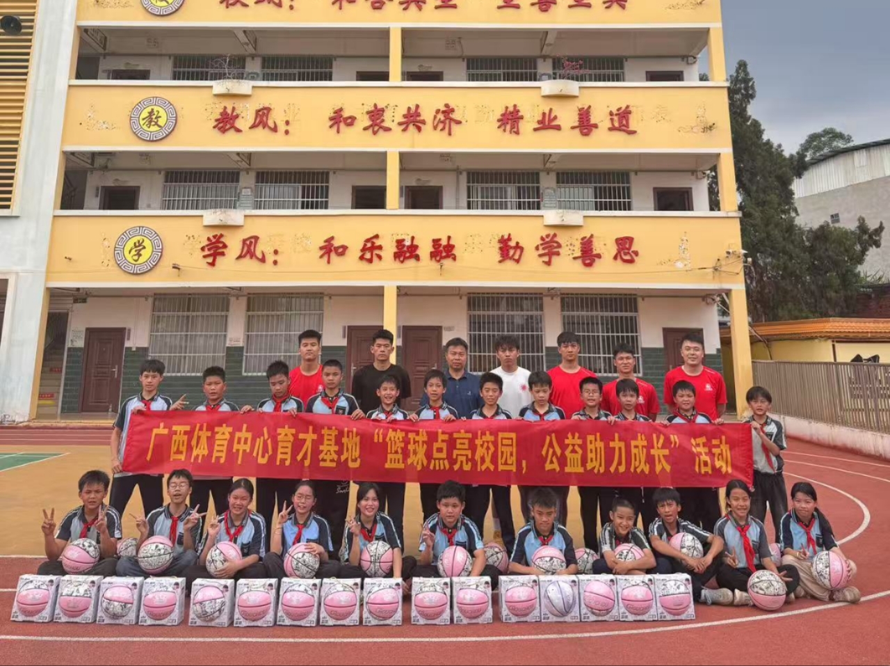 2025年4月至5月,广西体育中心育才基地联动周杰伦演唱会官方品牌"周同学",走进那马镇共和小学、金龙路小学、六里路小学、冬花路小学、滨湖路小学(五象校区)等5所小学,开展"篮球点亮校园,公益助力成长"主题活动。这场将演唱会文化势能转化为体育公益动能的创新实践,以"周同学"定制篮球为纽带,通过体育器材捐赠与公益课堂双线推进,在校园掀起篮球运动热潮。