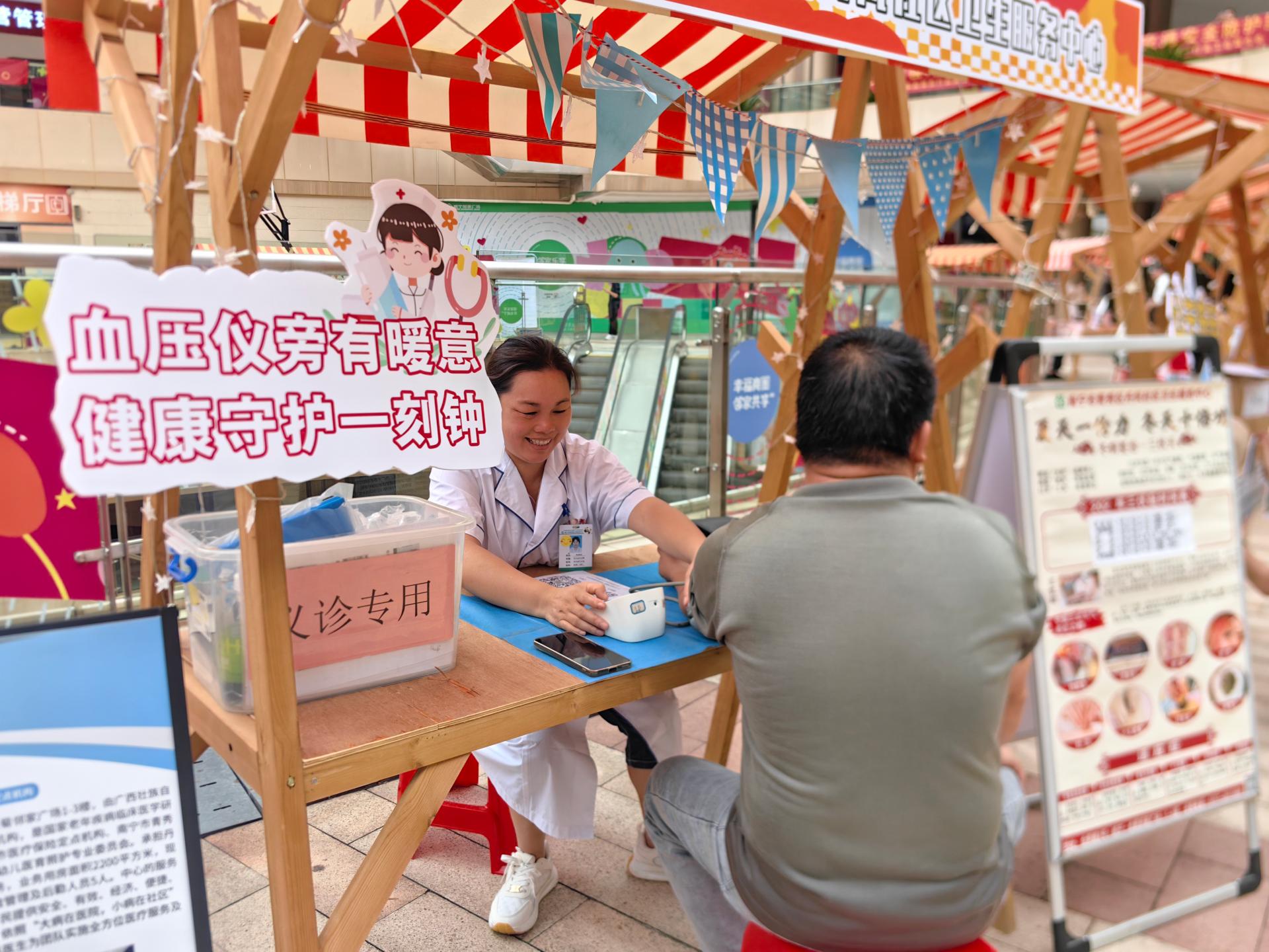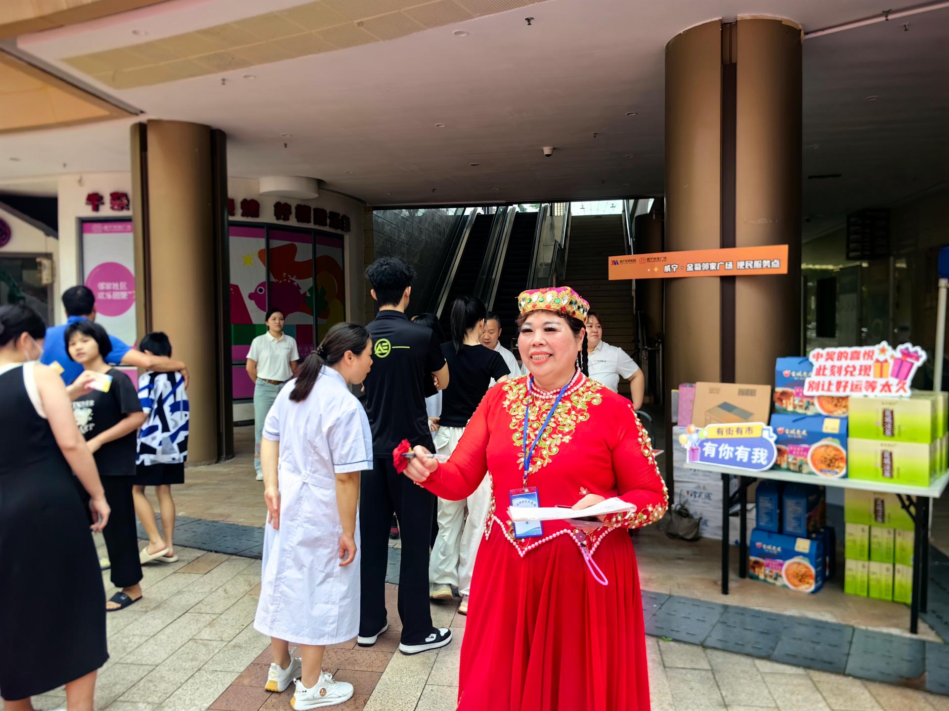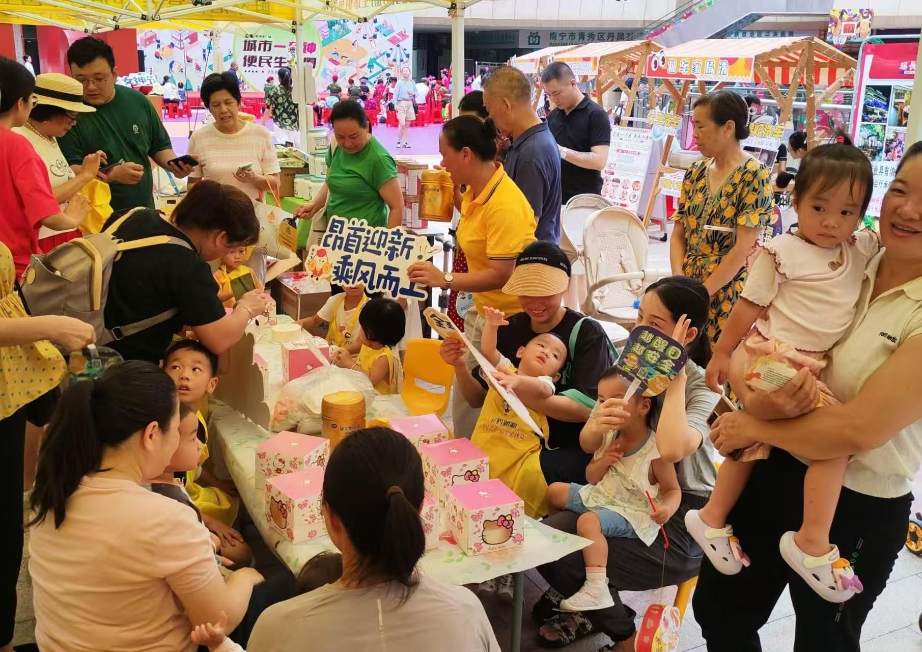 舞台上热闹不停,台下市集更是人气爆棚。瑶长府的油茶摊前,不到1小时就送出近100碗热乎油茶,浓郁香气里飘着邻里间的寒暄;安恩宝月子中心的免费三伏贴摊位前,宝妈们排起长队,老人们也来咨询养生知识,“一老一小”的关怀在这里悄悄流动;桂垦食堂的套圈游戏前,大人孩子齐上阵,套中广西香米的居民举着奖品笑称“这是一刻钟生活圈的第一份收获”。