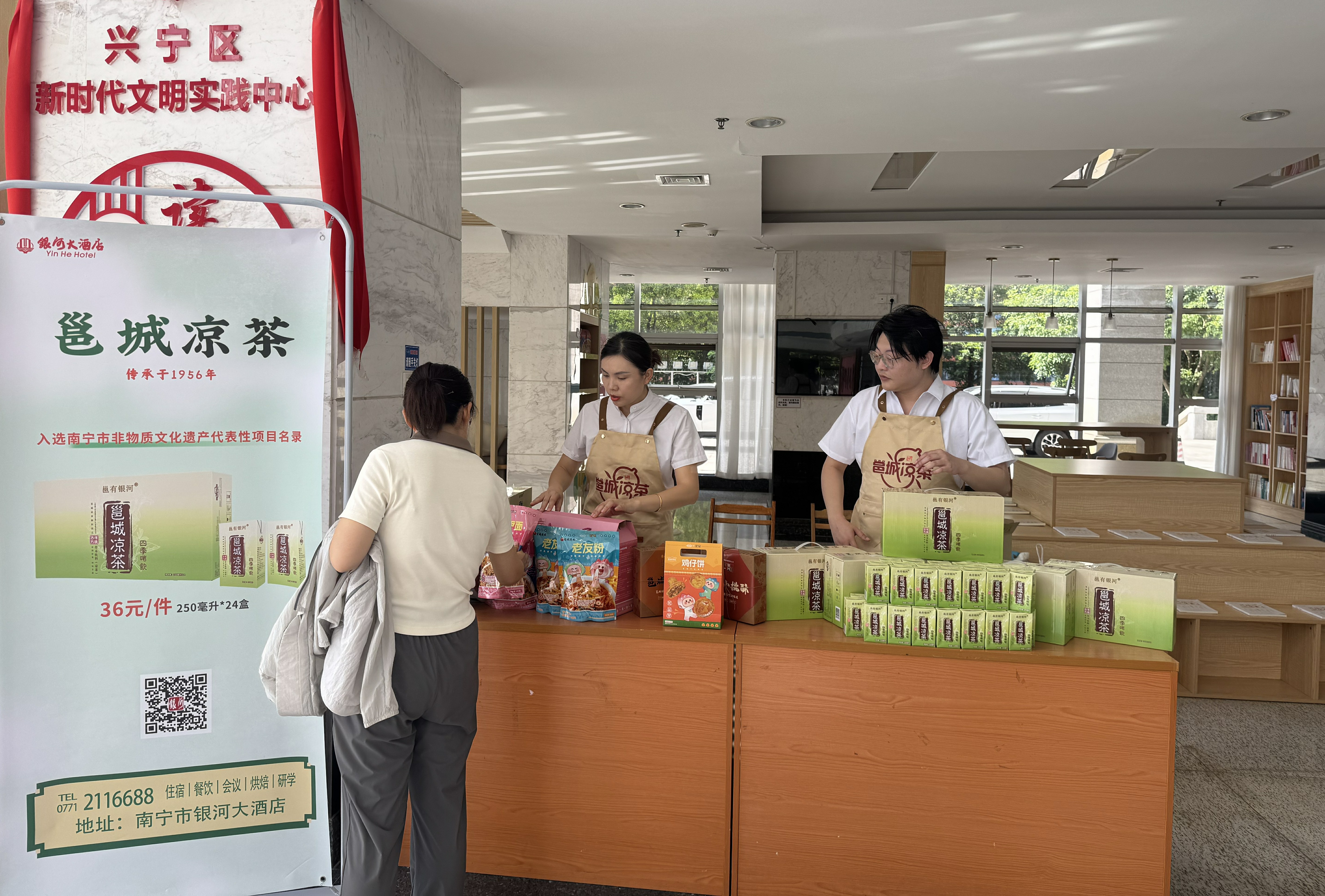 走进南宁的邮政惠民超市,“邕城凉茶”的绿色包装格外醒目;在广西体育中心的演唱会歌迷市集现场,装有“邕城凉茶”的“宠粉大礼包”成为观演标配;在广西文化艺术中心剧院大厅,观演结束的市民和观众也可以把解暑解渴的清凉“伴侣”带回家;而在三街两巷的“非遗集市”上,它更是成为展示本土文化的亮眼名片。线下渠道的深耕,让“邕城凉茶”迅速成为南宁本土的热门解暑伴手礼,大宗团购订单不断。自2025年6月以来,银河公司共收到上千箱的邕城凉茶大宗团购。