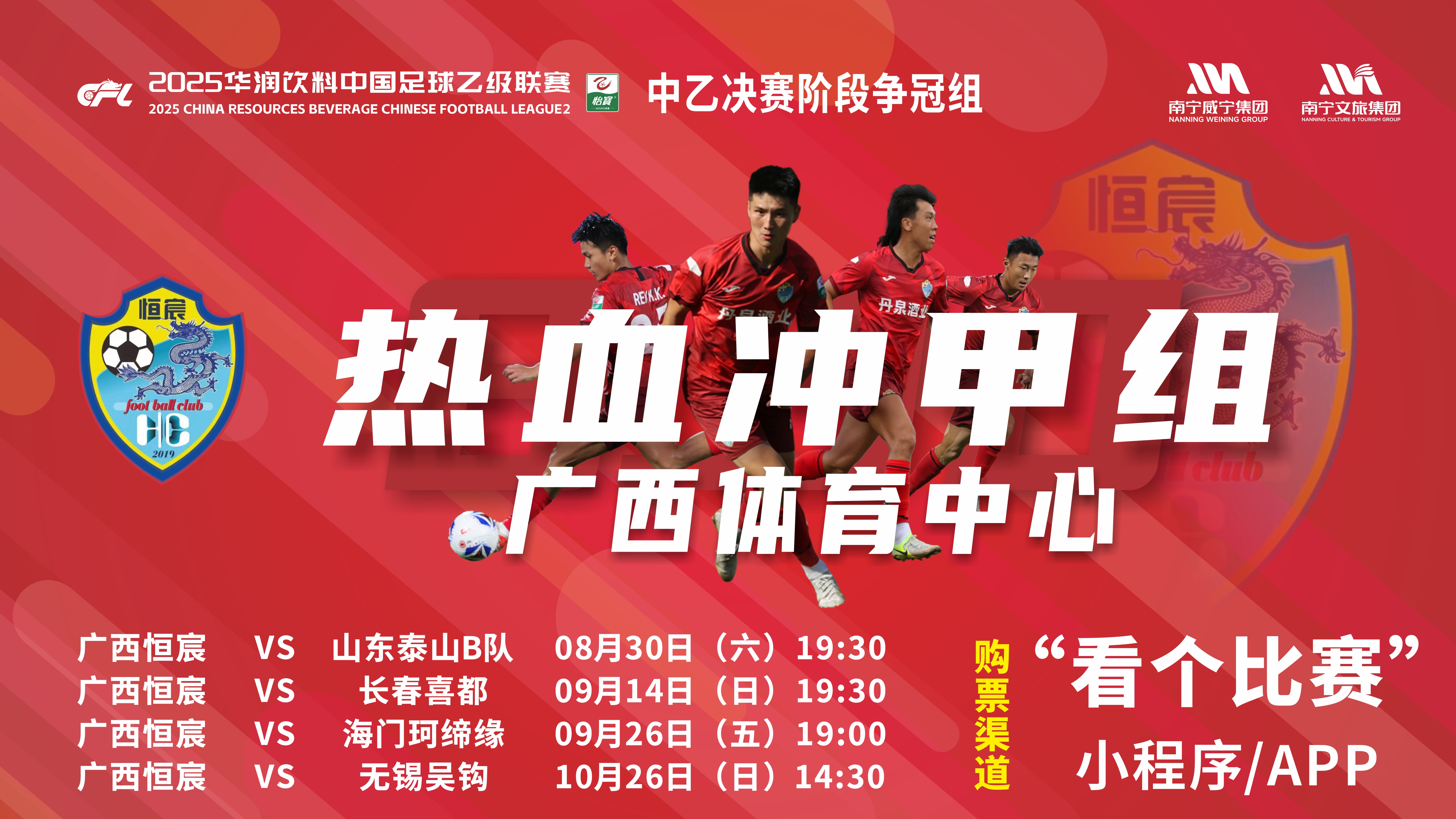 广西恒宸中乙争冠组下一场主场比赛将于9月14日19时30分在广西体育中心迎战长春喜都!目前门票预售已开启,在“看个比赛”小程序/APP即可购票,让我们继续走进赛场,为广西恒宸加油,见证更多主场荣耀时刻!