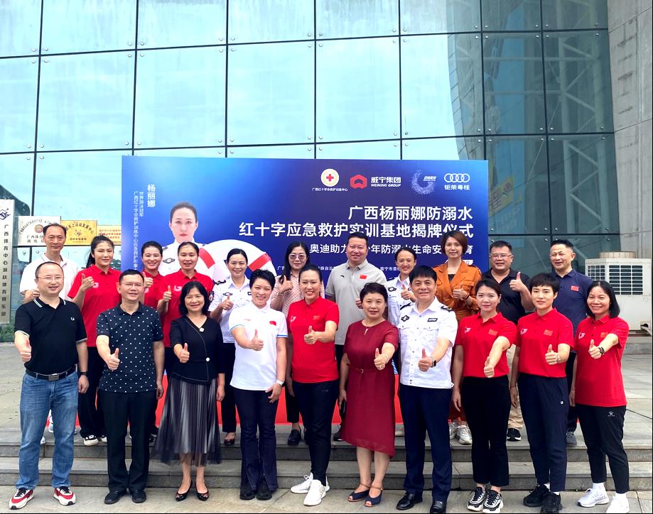 2022年6月18日上午9时,在广西体育中心游泳跳水馆由广西壮族自治区体育局、广西红十字会、南宁市委政协、南宁市统战部、南宁市教育局、南宁市体育局指导举办的首个广西杨丽娜防溺水红十字应急救护实训基地揭牌仪式取得圆满成功。