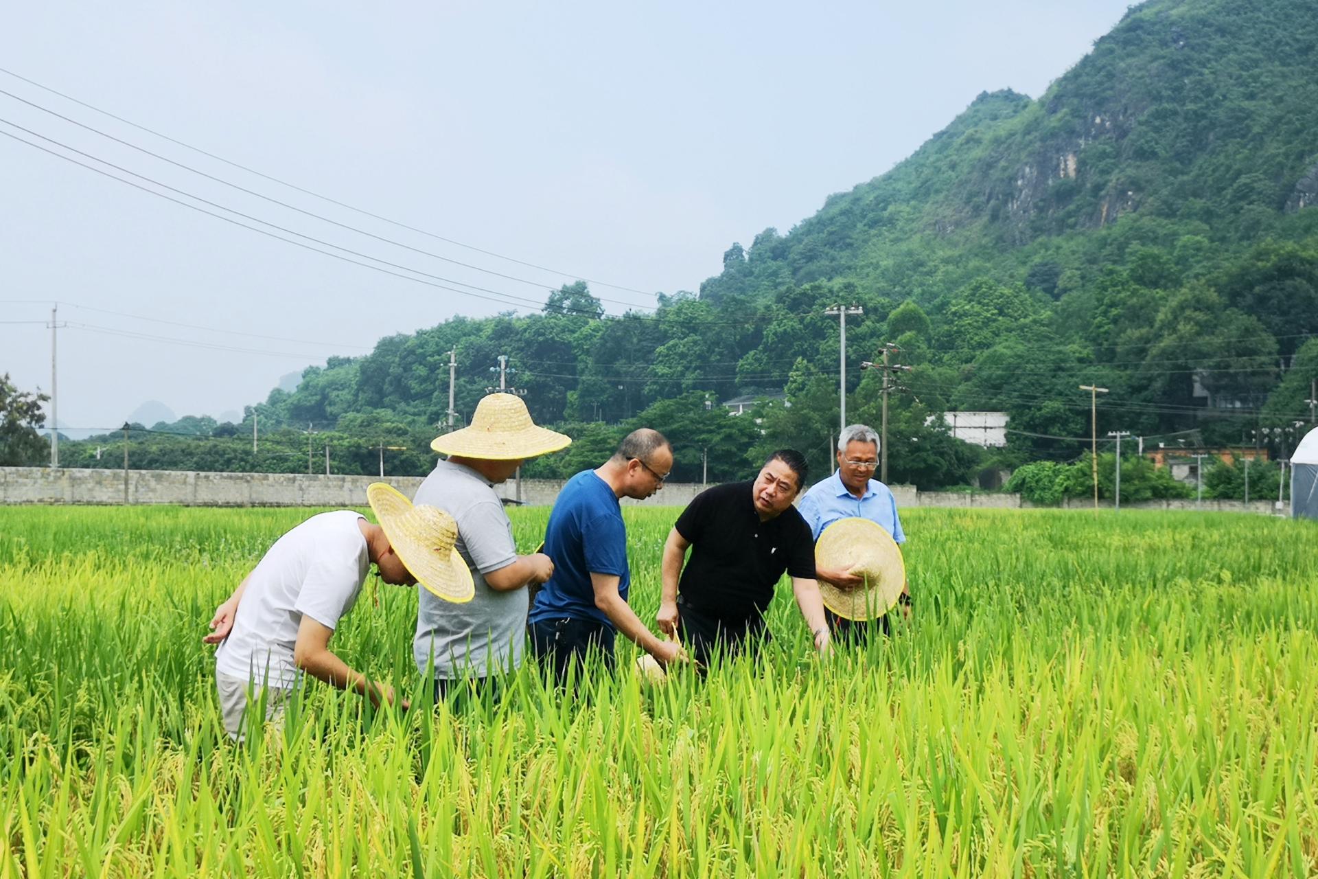 图 在武鸣区伊岭新品种示范展示基地了解优质稻新品种种植情况