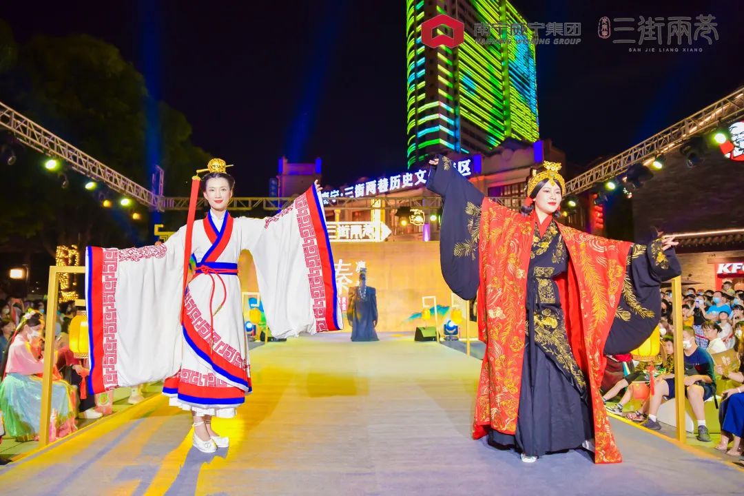 威邕城市运营开展头脑风暴,创新策划举办活动。“鸿福临门邕城盛市”三街两巷二期新街开放暨仓西门揭幕仪式系列活动、三街两巷新春嘉年华沉浸式国风系列活动、二期开街活动暨首届国风文化节等大型主题活动共计10余次,得到中央广播电视总台、广西日报、广西电视台、南宁市主流媒体等广泛报道,获得社会各界与广大游客的广泛关注。国庆期间,“三街两巷首届国风文化节”活动,游客接待量超70万人次,同比2021年国庆假期增长40%,营业额超5000万元,同比2021年国庆假期增长317%。主题活动的成功举办,促进了街区人流量、消费量“双量”提升,极大的提升了商户的经营信心,促进了招商工作的推进。(图5.三街两巷2022年国庆活动)