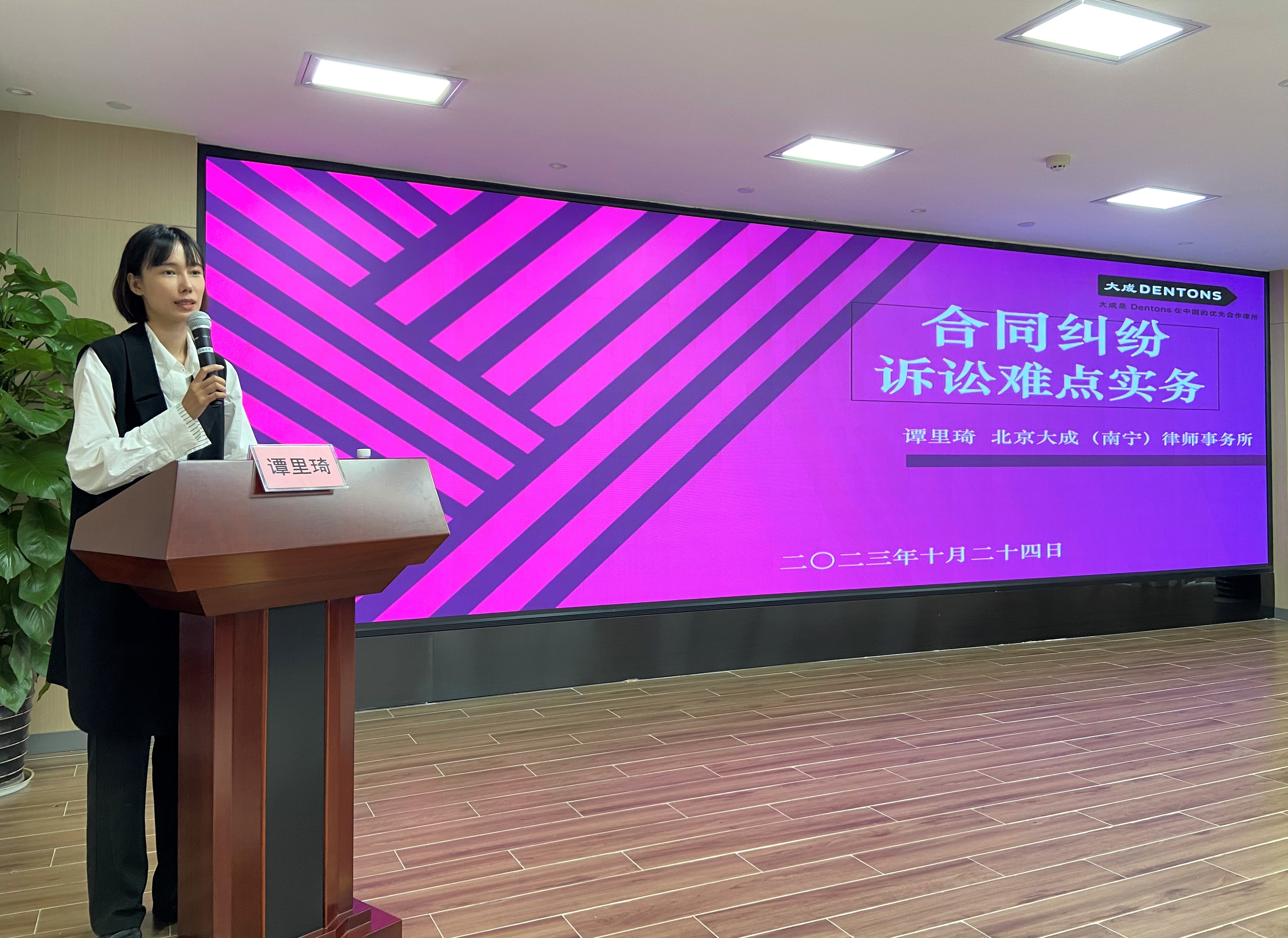 培训邀请集团公司常年法律顾问单位北京大成(南宁)律师事务所资深律师谭里琦主讲,围绕“合同纠纷管辖”“合同效力判断”“合同履行违约争议”“合同解除裁判规则”四个方面,通过合同法律知识结合实际案例的方式,聚焦集团业务,分享了合同常见纠纷及诉讼难点法律实务方式方法和注意事项,对合同签订、履约、解除过程中容易产生纠纷的风险点及诉讼难点进行深入分析和讲解。