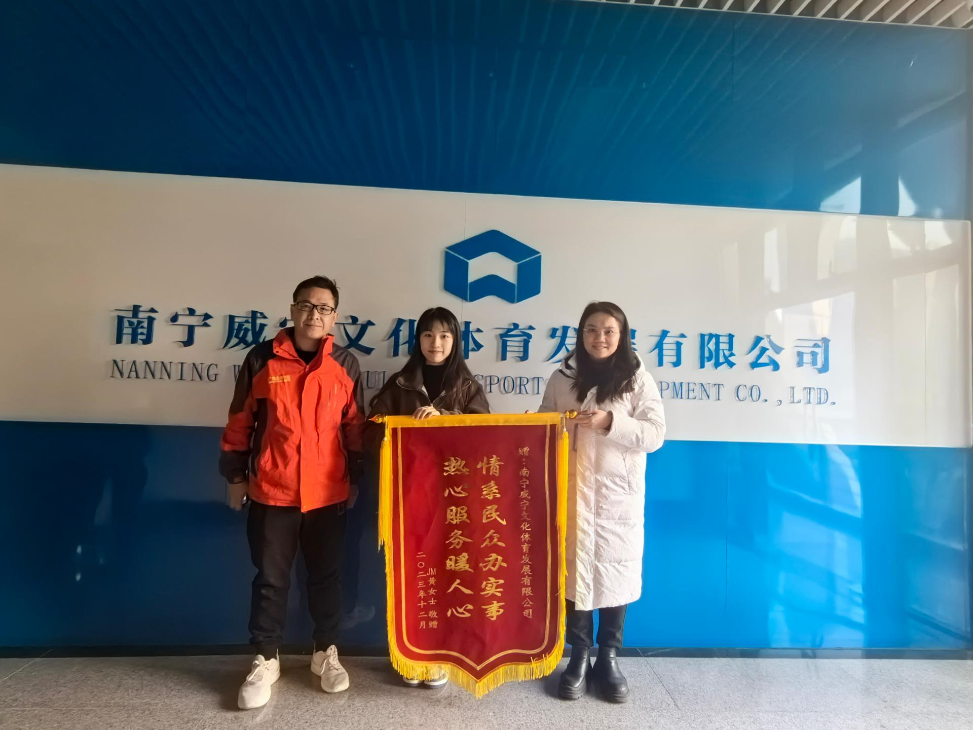 12月25日,一位在林俊杰演唱会上“失而复得”手机的观众给C7(中国)文体公司送来一面锦旗,失主黄女士说,广西体育中心给前来观看演唱会的观众来带温暖贴心的服务,让我们感受到在这里举办的活动非常安全且有保障,可以尽情享受演唱会的热烈气氛!