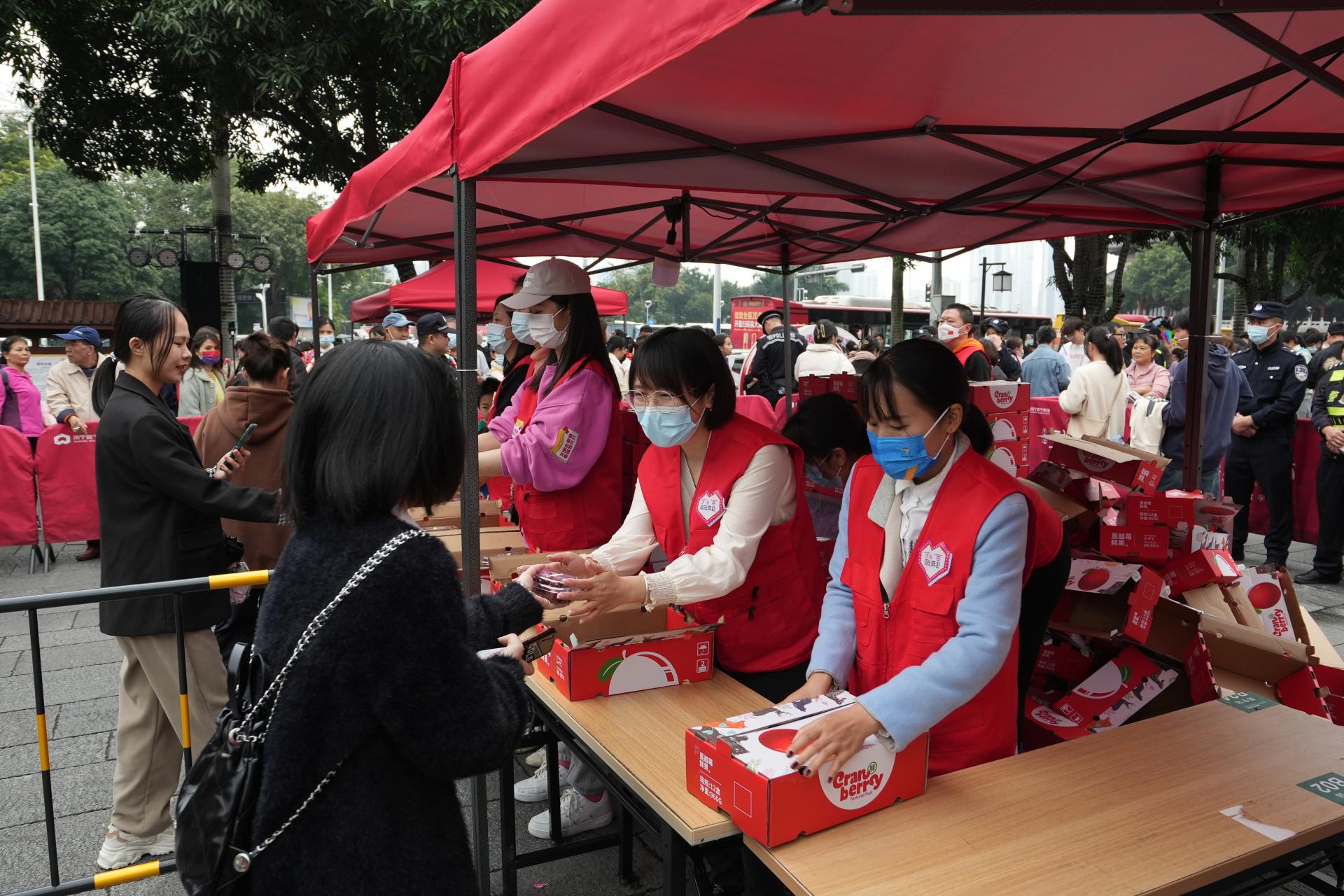 雨水浇不灭南宁市民的热情。在1月11日—1月14日的四天派发活动时间里,大批市民抵达邕州古城·三街两巷,高峰期现场客流量高达近1.5万人次,车流量近3千辆次,为了确保邕州古城·三街两巷发放现场安全到位、氛围布置到位,威邕城市运营集团组织人手通宵完成活动物料进场及布置工作;面对强降雨天气,公司迅速作出反应,组织志愿者为市民游客提供“爱心雨衣”,第一时间熬煮暖心姜茶,通过小小善举,将暖意传递到每个人心底,受到市民群众一致夸赞;在派发活动高峰期,针对可预见的客流激增态势,公司组织精干人防覆盖重要点位,增强巡防频次、密度,严防拥挤、推搡、踩踏、走散等意外事件发生,确保发放现场安全有序进行。此外,公司还为第一次见到蔓越莓的南宁市民准备了现场试吃点,让市民群众了解了蔓越莓多样化的食用方法,并解锁蔓越莓酸嘢的南宁做法。