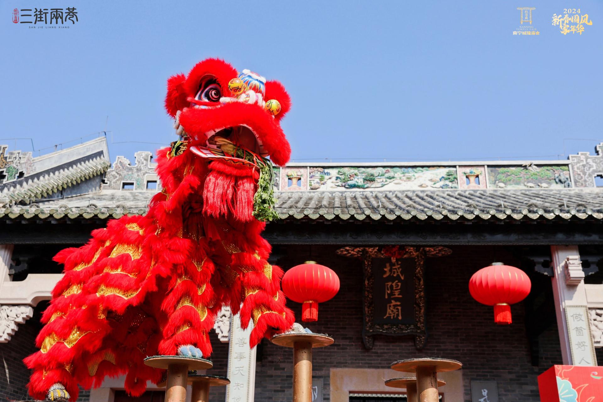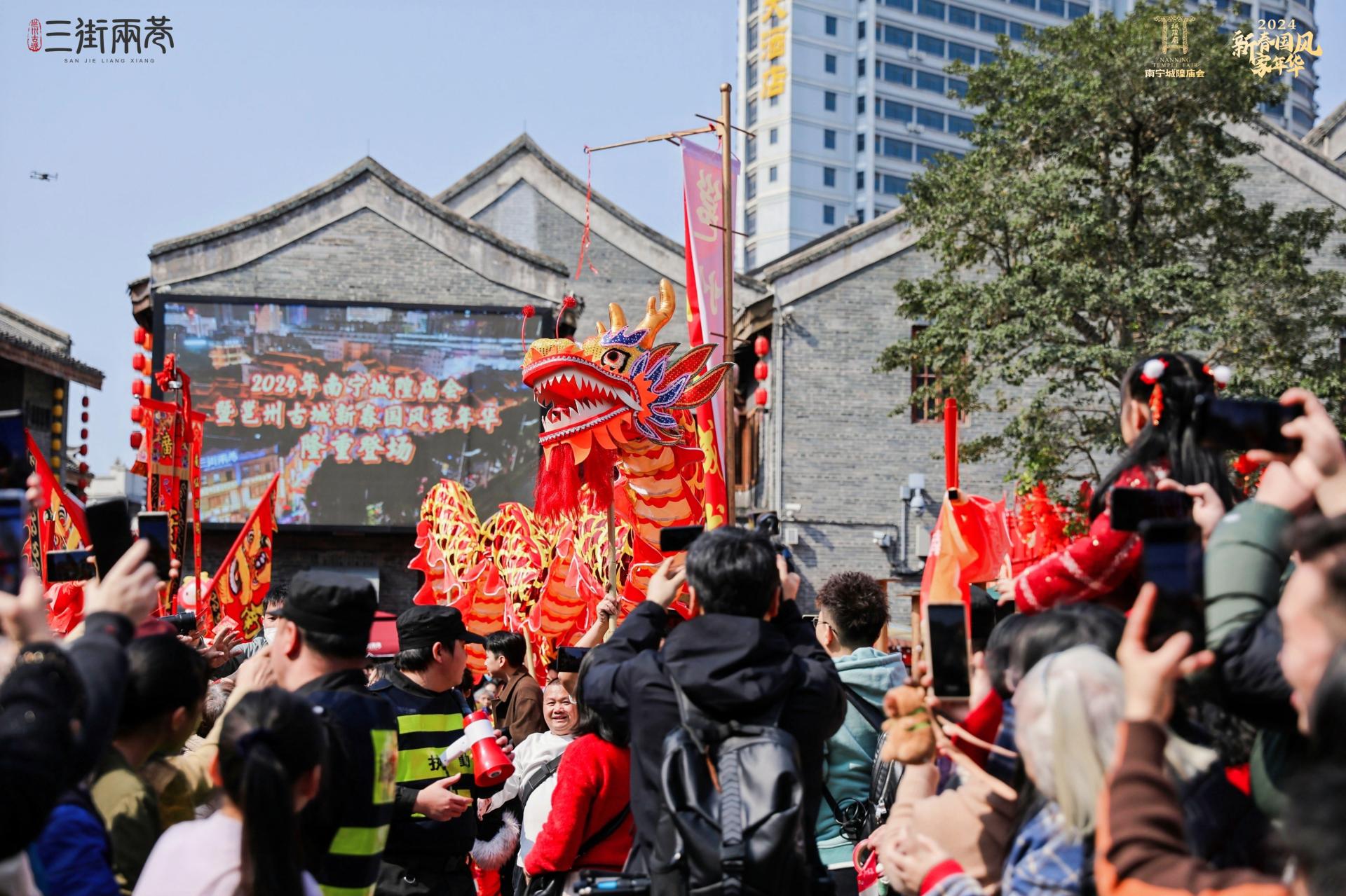 龙腾盛世,福满乾坤。2月10日,农历大年初一,随着祥龙瑞狮在城隍庙广场热闹开演,2024年南宁城隍庙会暨邕州古城新春国风家年华系列活动正式拉开帷幕。在祥龙瑞狮祈福巡游环节,邕州古城·三街两巷用传统舞狮舞龙表演、祥龙瑞狮巡游等迎新方式,在老街旧巷里巡游嬉舞,为广大市民迎春接福,沉浸式体验传统春节文化习俗。