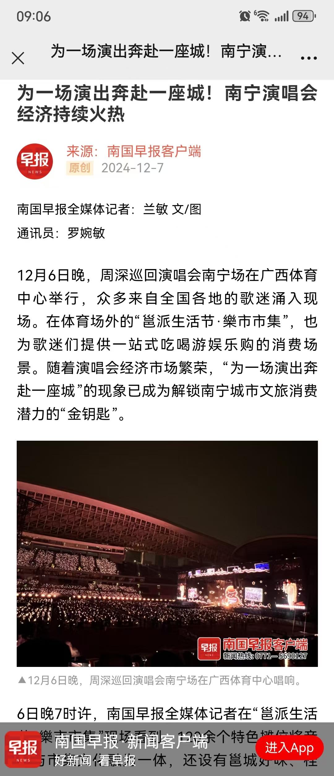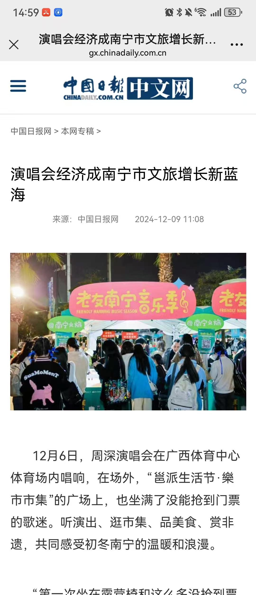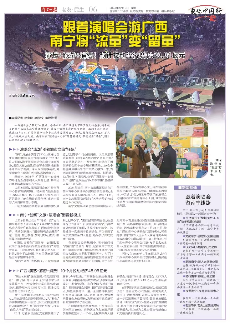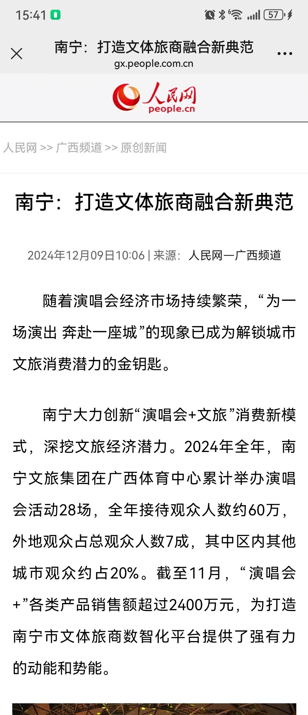 南宁创新“演唱会+文旅”消费新模式,2024年预计拉动经济增长28.81亿元。在这场城市文旅狂飙赛上,南宁文旅集团激流勇进,在广西体育中心举办和申报的演唱会和音乐节活动共计28场。本次南宁周深演唱会不仅是音乐爱好者的盛宴,更是南宁文旅集团展示其助力南宁演唱会经济、推动文旅体商融合发展的重要契机。通过邀请媒体参与此次媒体行活动,旨在深入宣传南宁文旅集团的品牌形象,展示其在文旅产业发展中的新成就,进一步提升南宁市文旅品牌形象。