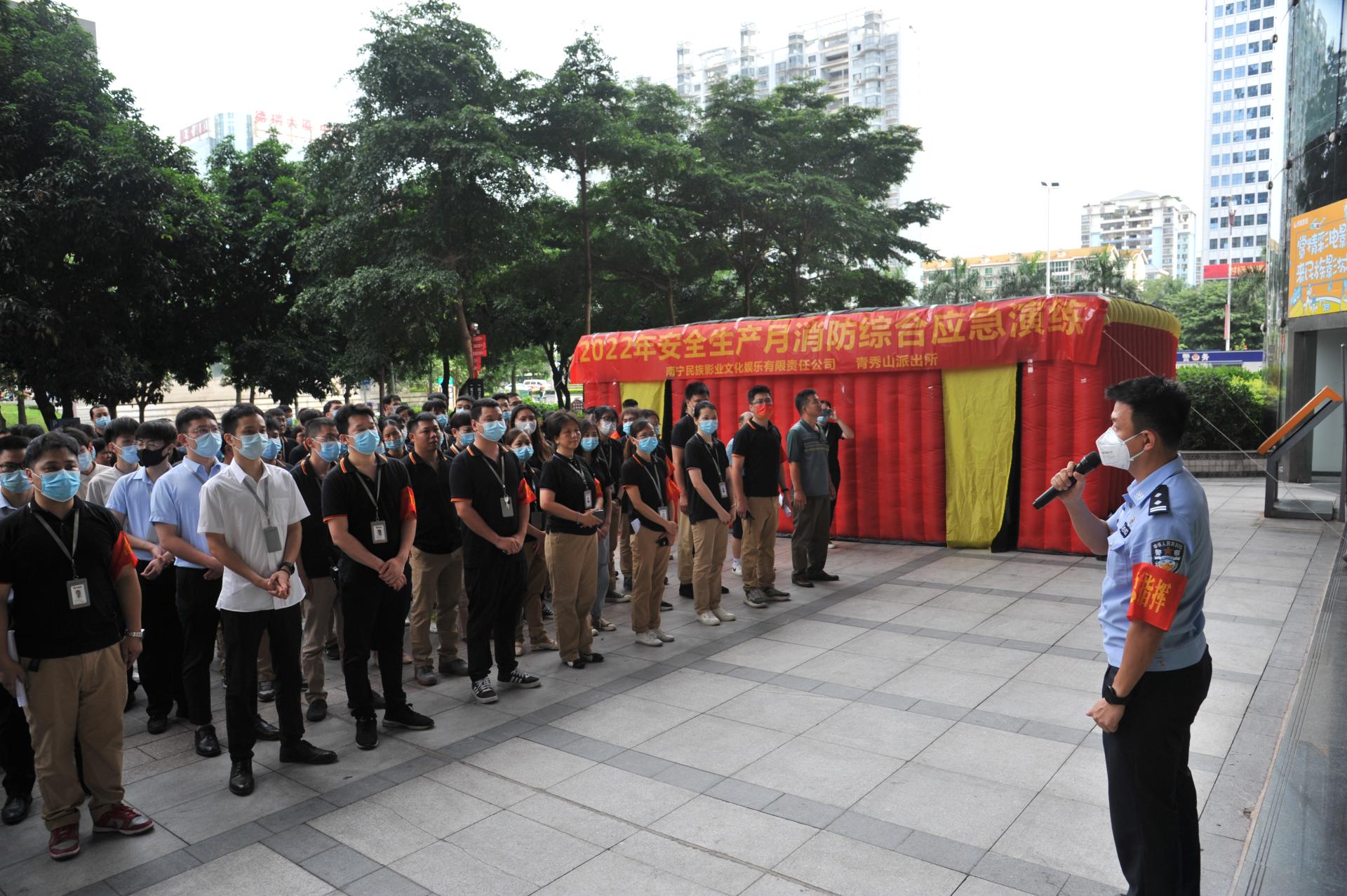 由南宁大地飞歌文化集团有限责任公司主办(下称南宁大地飞歌集团公司)、青秀山派出所、南宁民族影业文化娱乐有限责任公司(下称民影公司)、南宁民族时代影业有限公司(下称时代公司)联合承办的2022年“安全生产月”消防疏散防踩踏应急逃生演练,于2022年6月22日上午在民族影城举行。南宁大地飞歌集团公司各部门负责人及员工、青秀山派出所部分民警、民影公司、时代公司全体人员、一分公司、影城各租赁企业(商户)部分代表参加演练。