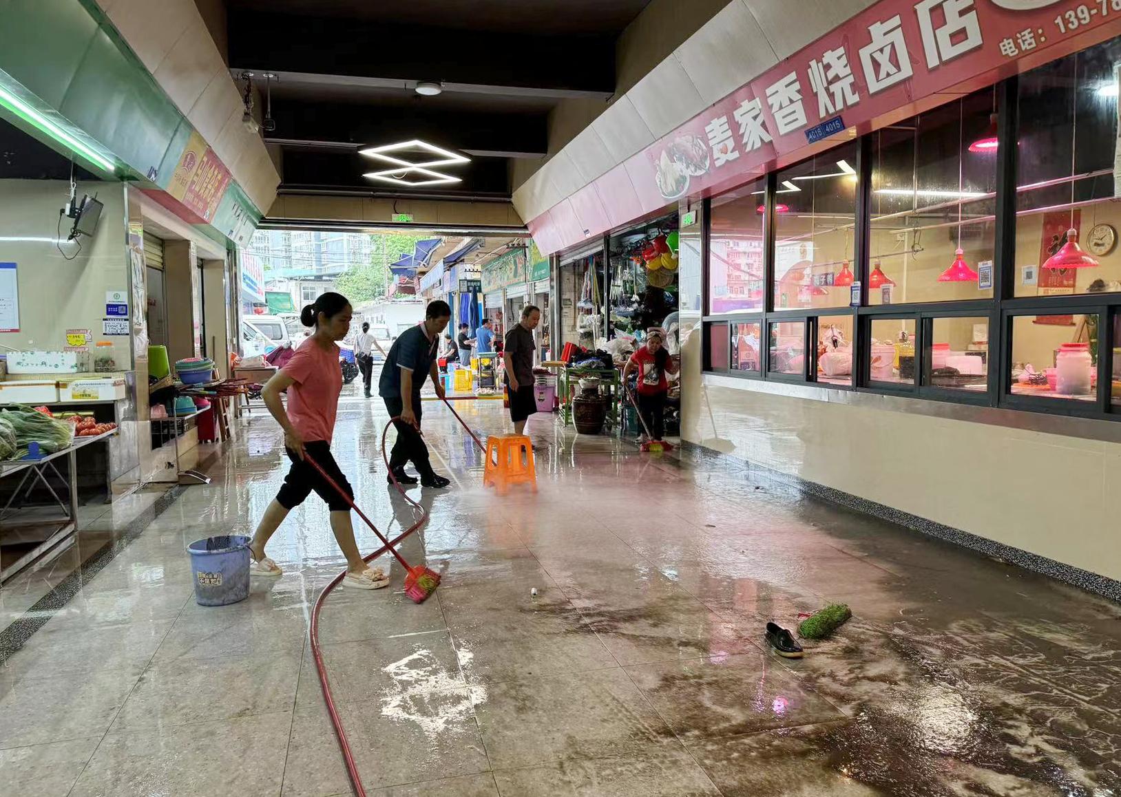 强降雨导致公司所属多处市场区域积水,其中内涝情况最为严重的市场积水深度最高达50厘米。面对汹涌而来的内涝积水,各所属市场及时切断电源,积极组织市场管理人员帮助经营户转移物资。同时安排人员到市场周边,设置安全提醒标识,并安排专员值守疏散群众,切实保障附近群众出行安全。待大雨逐渐变小,积水清退后,各市场迅速清理淤积垃圾,开展市场消毒工作,以最快速度恢复市场干净整洁、正常经营,有效保障了人民群众生命财产及出行安全,保障了市场供应。