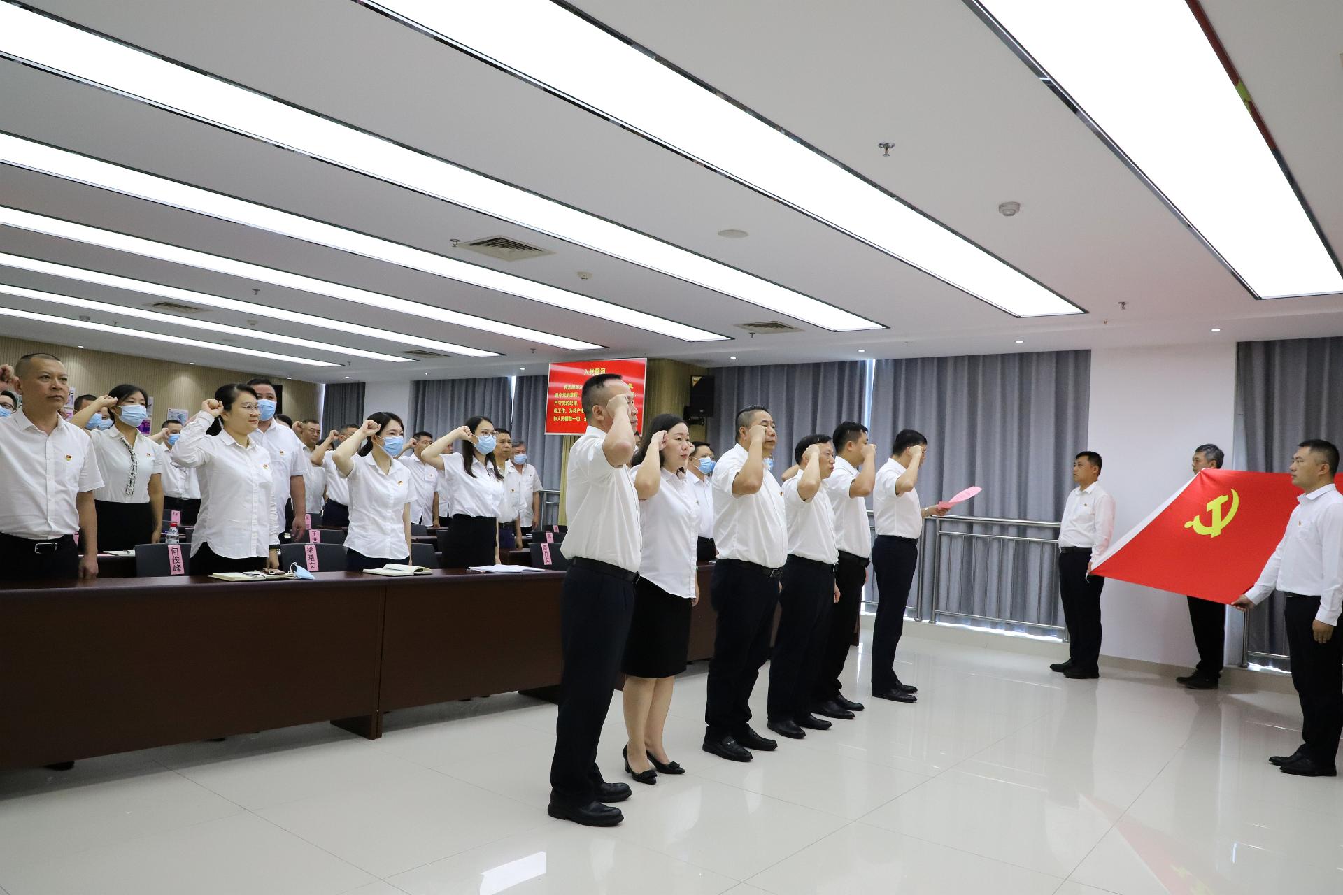 会议在高亢激昂的《义勇军进行曲》中拉开帷幕,在李林带领下,全体党员面对鲜红的党旗,重温入党誓词。满怀激情的宣誓声在耳畔回响,铿锵有力的宣誓,表达了公司共产党员的责任与担当,再次许下了对党忠诚、永不叛党的坚定承诺。