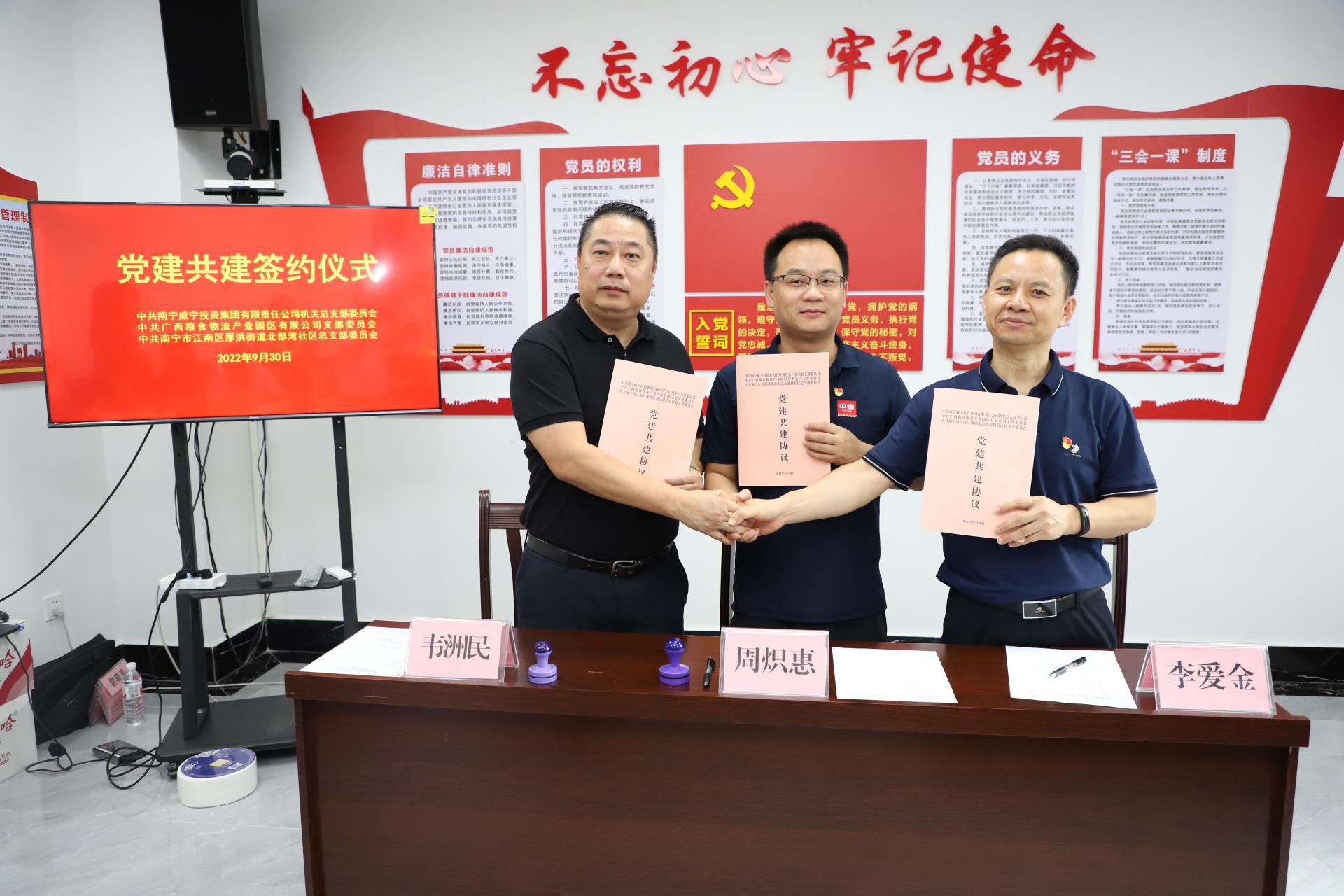 为庆祝新中国成立73周年华诞,喜迎党的二十大胜利召开,9月30日上午,粮食园区公司党支部联合c7网站机关党总支到那洪街道办北部湾社区开展“欢度国庆·喜迎二十大”主题党建共建活动。c7网站机关党总支书记、群工部部长李爱金,粮食园区公司党支部书记、总经理韦洲民,北部湾社区党总支书记、居委会主任周炽惠共同出席共建活动。