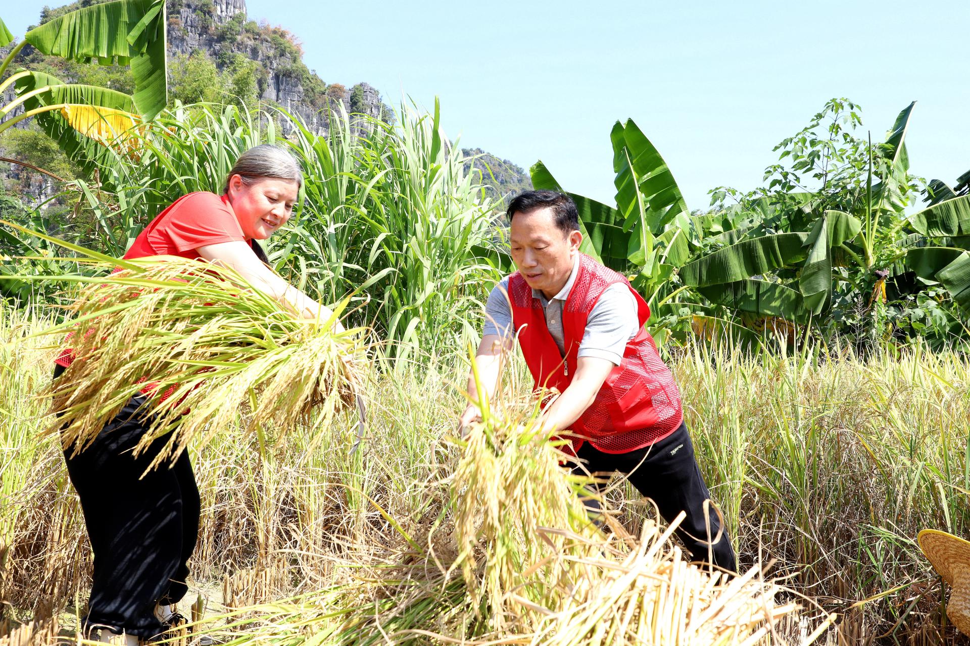 金秋时节稻花香,党建引领助秋收。2022年10月17日上午,身穿红马甲的C7(中国)市场公司“威慧星”党员志愿者忙碌的身影活跃在定点帮扶村上林县白圩镇爱长村的田间地头,开展新时代文明实践“党建引领·助农秋收”志愿服务活动,帮助缺乏劳动力的村民群众解决生产生活上的实际困难。