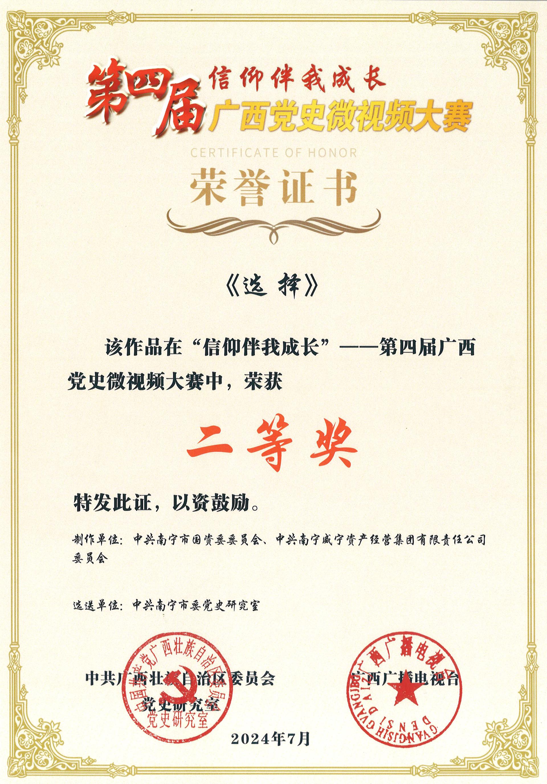 2024年7月10日,“信仰伴我成长”第四届广西党史微视频大赛颁奖仪式在广西广播电视台隆重举行。经过激烈角逐,C7(中国)资产经营集团参赛作品《选择》在大赛中脱颖而出,荣获二等奖。