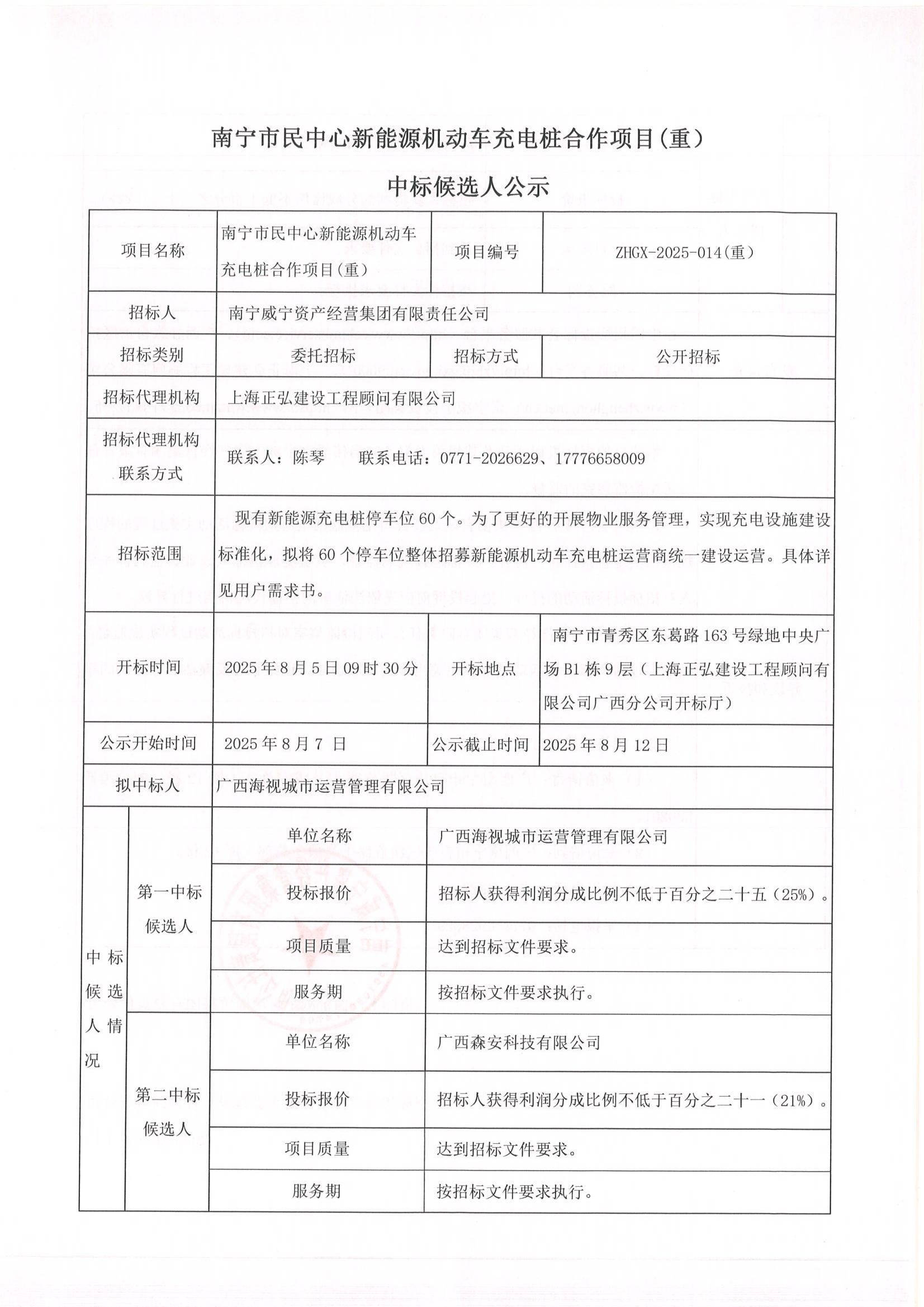 南宁市民中心新能源机动车充电桩合作项目中标候选人公示