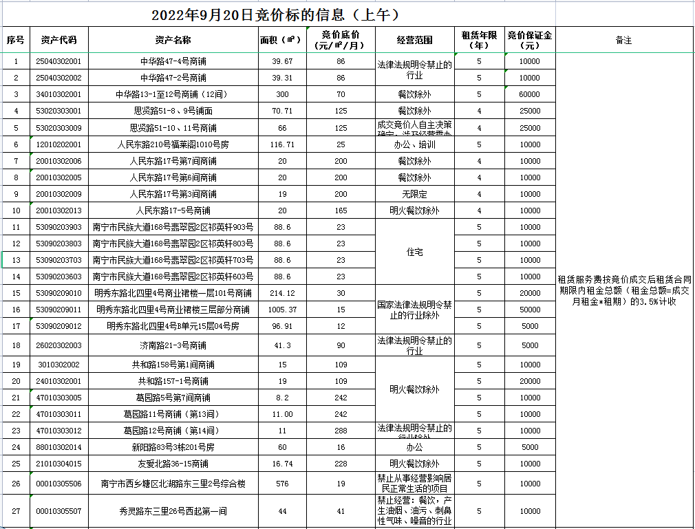 C7(中国)资产公司2022年9月20日公开竞价标的信息