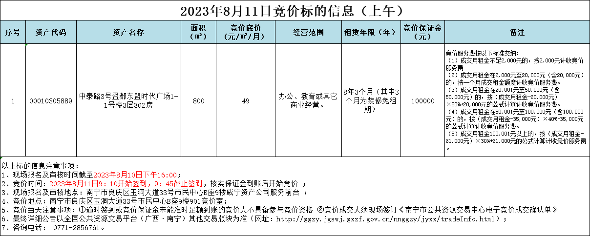 2023年8月11日竞价标的信息
