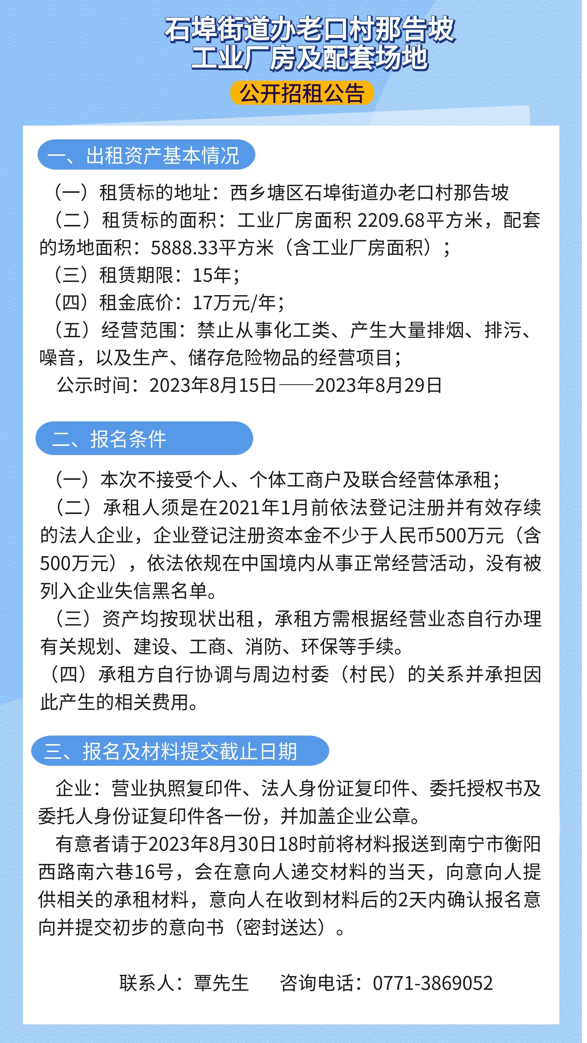 【招租公告】石埠街道办老口村那告坡工业厂房及配套场地