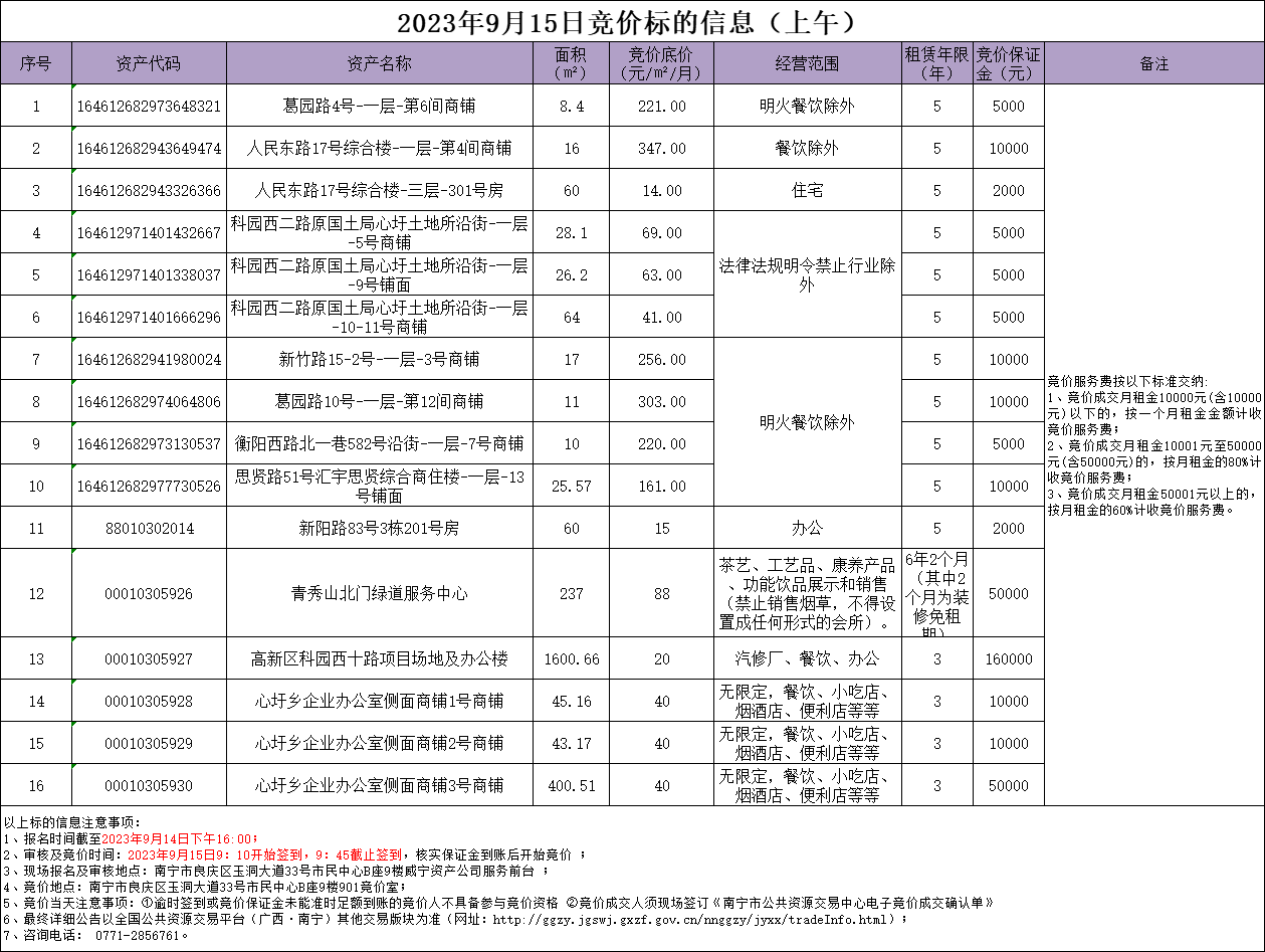2023年9月15日竞价标的信息