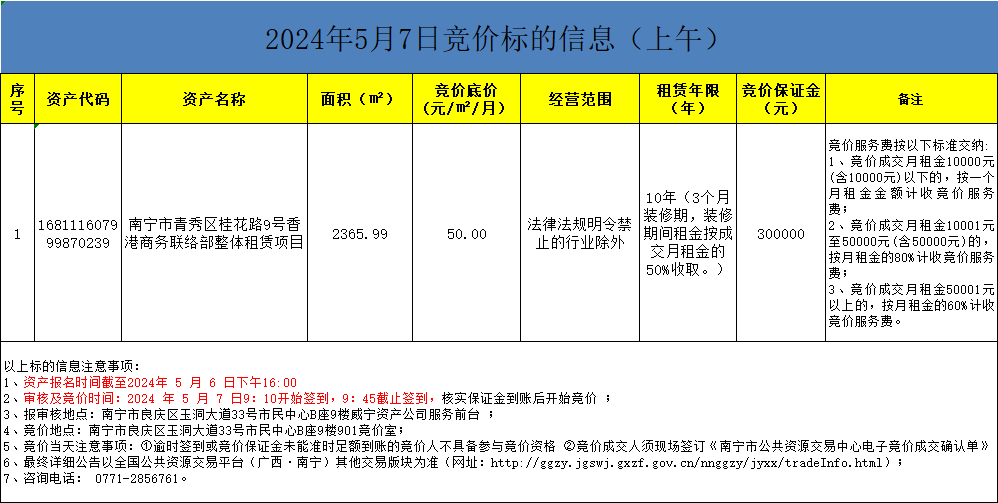 2024年5月7日竞价标的信息(现场竞价)