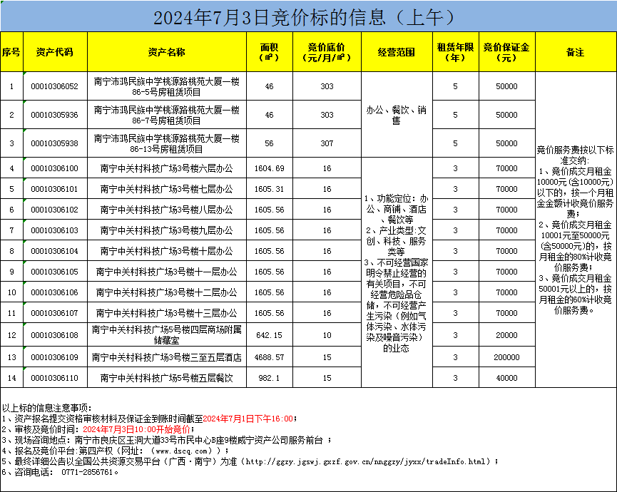 2024年7月3日竞价标的信息(线上竞价)