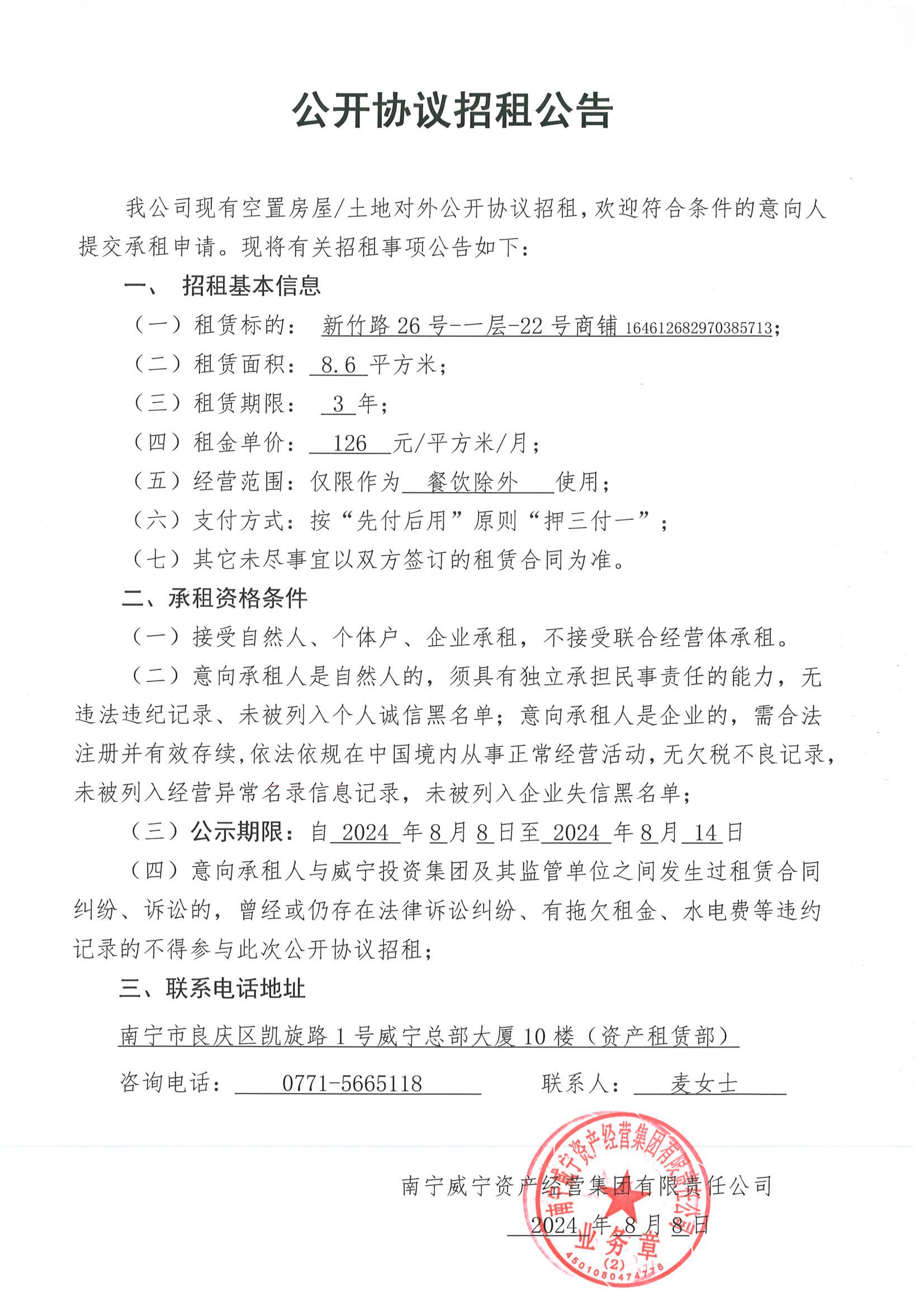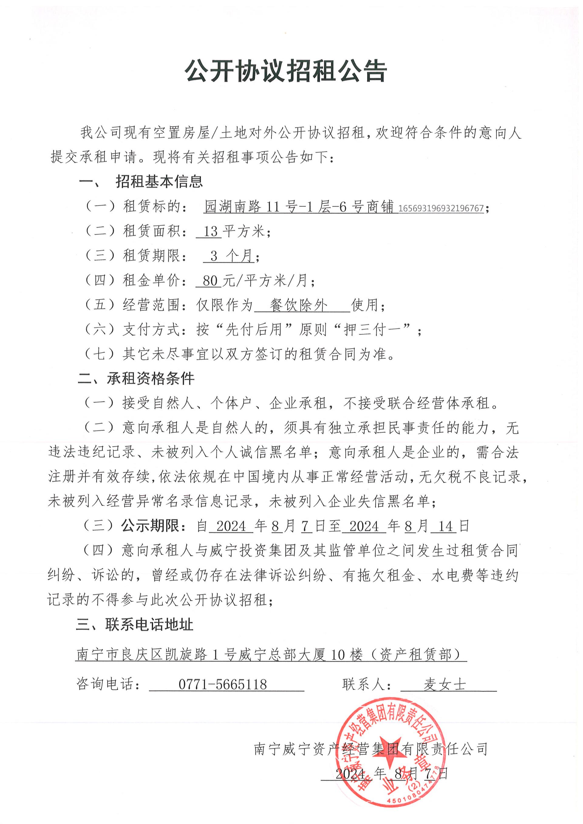 新竹路26-22号商铺及园湖南路11号1层6号铺公开协议招租公告