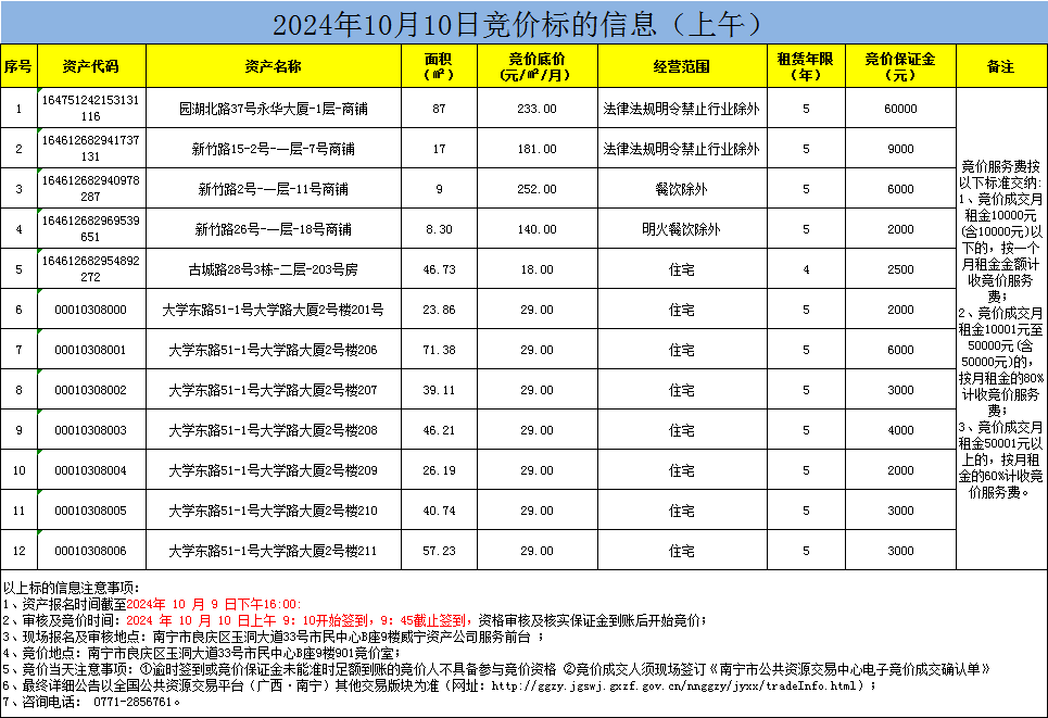 2024年10月10日竞价标的信息(现场竞价)