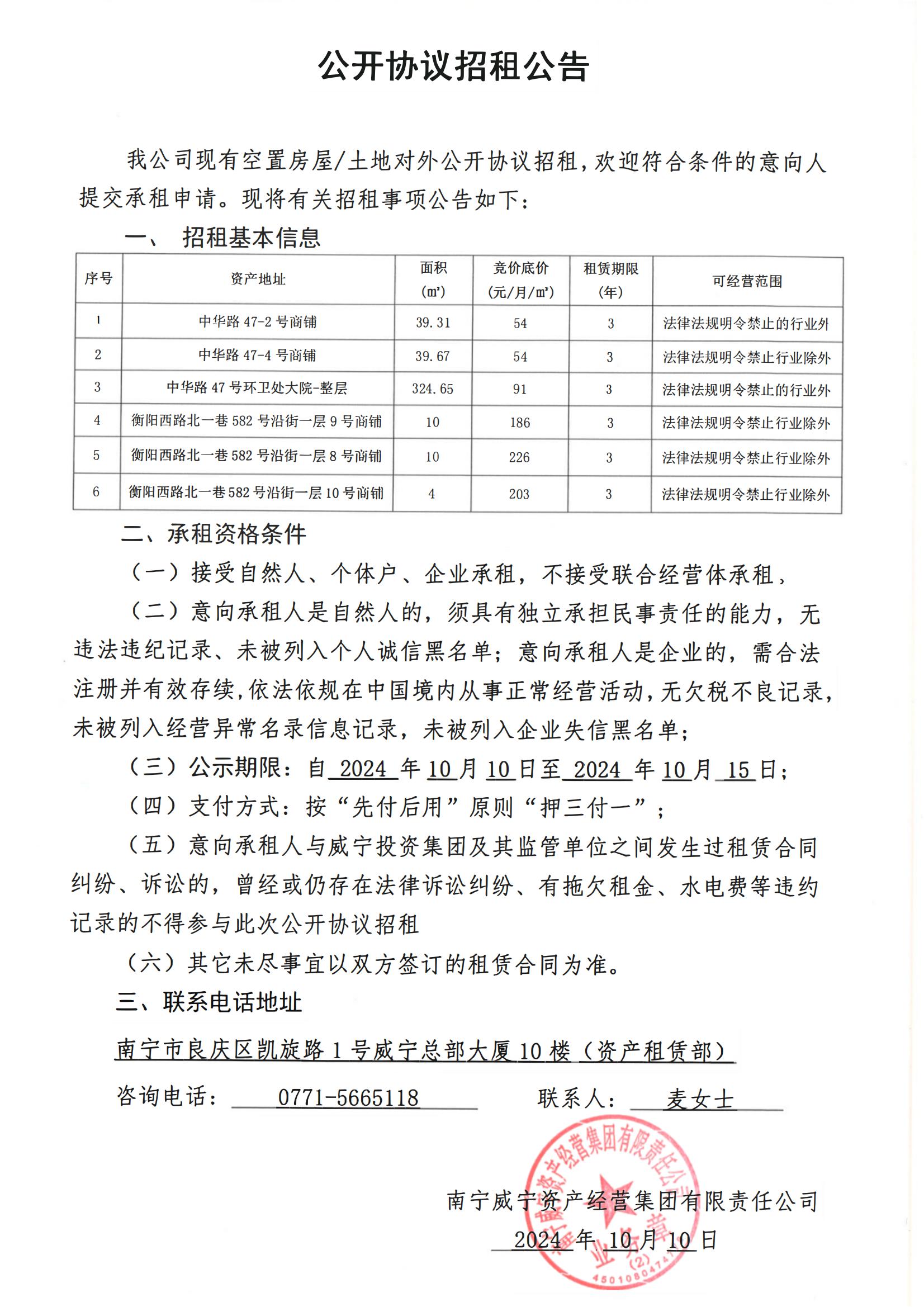 中华路47号及衡阳西路北一巷582号等资产公开协议出租公告