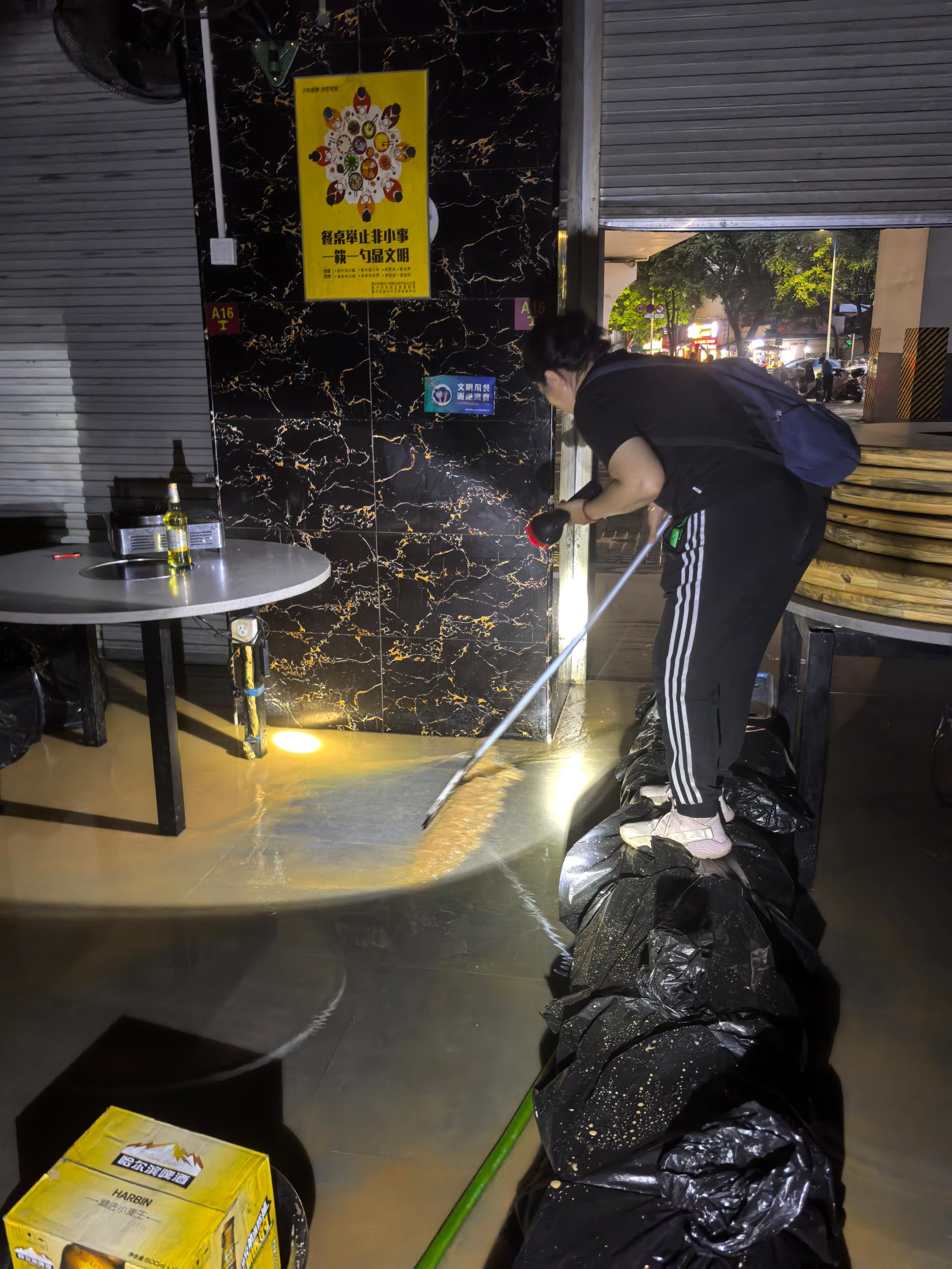 一张张桌椅,一台台电器,手与手的接力,心与心的相连。防汛应急小组的组员们不间断对南宁港、邕州老街、亭子码头等漏水点做好标记和储水,一心只想着“避免更大的损失”,丝毫顾不上去处理从墙面缝隙喷溅在身上的洪水,身上的衣物在一天内多次干湿交换,不少组员甚至带病坚持,但有他们在就能让经营户感到十分安心。“非常感谢你们,如果不是你们,我这些货可能就保不住了!”南宁港21-26号商铺莫老板感谢道。
