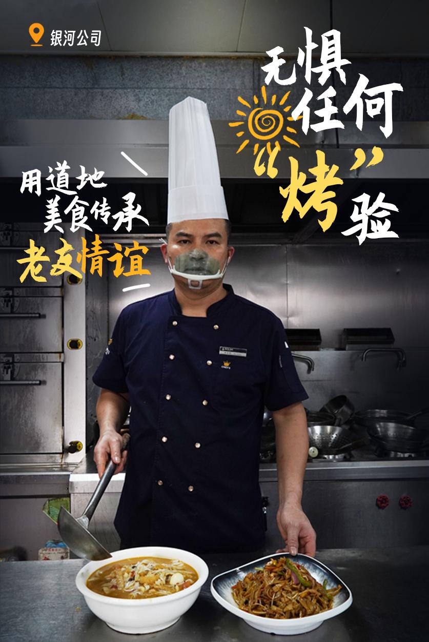 厨房灶台附近温度高达45摄氏度,银河大酒店主厨在高温下烹制“古城老友”炒粉。银河大酒店“古城老友”系列菜品,已经成为银河食客们口口相传的明星菜品。