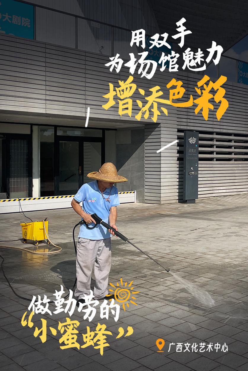为保障场馆环境卫生,广西文化艺术中心环境服务团队用细致的工作态度对公共区域完成卫生清洁,虽然灰尘与汗水沾满脸颊,但依旧做到垃圾日产日清,场馆整洁如新。