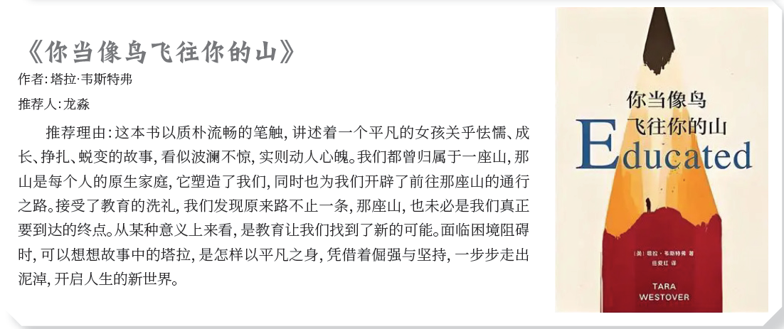作者:塔拉·韦斯特弗 推荐人:龙淼 推荐理由:这本书以质朴流畅的笔触,讲述着一个平凡的女孩关乎怯懦、成 长、挣扎、蜕变的故事,看似波澜不惊,实则动人心魄。我们都曾归属于一座山,那 山是每个人的原生家庭,它塑造了我们,同时也为我们开辟了前往那座山的通行 之路。接受了教育的洗礼,我们发现原来路不止一条,那座山,也未必是我们真正 要到达的终点。从某种意义上来看,是教育让我们找到了新的可能。面临困境阻碍 时,可以想想故事中的塔拉,是怎样以平凡之身,凭借着倔强与坚持,一步步走出 泥淖,开启人生的新世界。