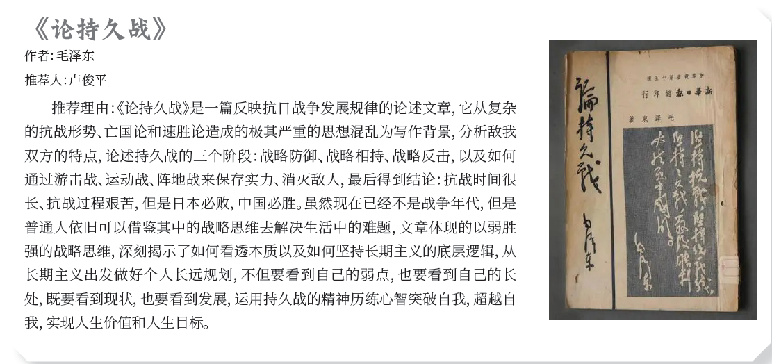 作者:毛泽东 推荐人:卢俊平 推荐理由:《论持久战》是一篇反映抗日战争发展规律的论述文章,它从复杂 的抗战形势、亡国论和速胜论造成的极其严重的思想混乱为写作背景,分析敌我 双方的特点,论述持久战的三个阶段:战略防御、战略相持、战略反击,以及如何 通过游击战、运动战、阵地战来保存实力、消灭敌人,最后得到结论:抗战时间很 长、抗战过程艰苦,但是日本必败,中国必胜。虽然现在已经不是战争年代,但是 普通人依旧可以借鉴其中的战略思维去解决生活中的难题,文章体现的以弱胜 强的战略思维,深刻揭示了如何看透本质以及如何坚持长期主义的底层逻辑,从 长期主义出发做好个人长远规划,不但要看到自己的弱点,也要看到自己的长 处,既要看到现状,也要看到发展,运用持久战的精神历练心智突破自我,超越自 我,实现人生价值和人生目标。