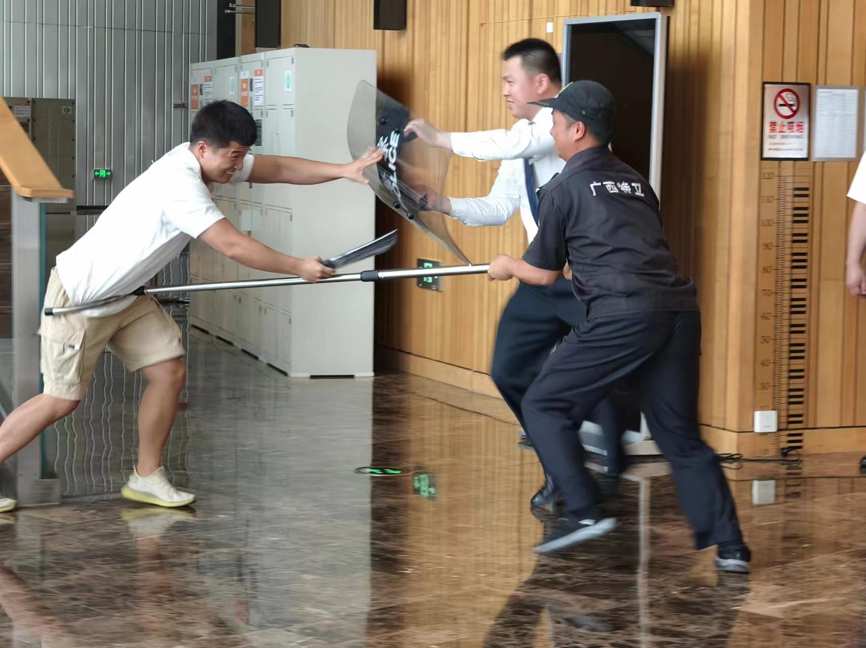 “遇到车辆冲撞袭击,不要在车头往前跑,人没有车跑得快;比较好的办法是往车头的左侧后方或右侧后方,也就是往车子前轮后方方向跑,因为车子转向掉头没那么快,这样逃脱的机会比较大”“控制歹徒,用一面盾牌和一把钢叉,两人一组协同作战效果好;盾牌要大胆迎前推挡,能有效限制歹徒发力,配合钢叉圈歹徒的腰,可以很好起到阻挡和控制”……这是南宁文旅集团近期开展防恐防暴应急演练现场的一幕幕场景。为进一步强化应急处理...