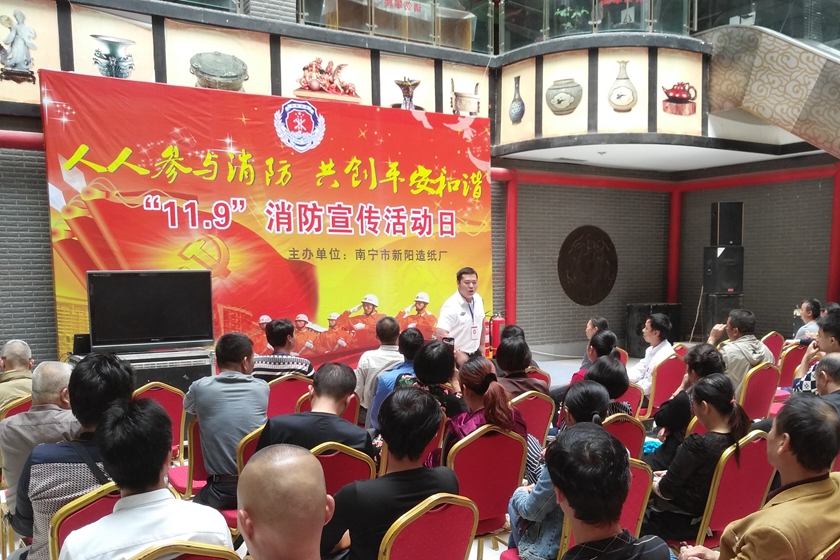 2017年11月8日,南宁市新阳造纸厂以“全国消防安全宣传日”为契机,在造纸厂综合楼一楼大堂搭建讲台,开展“人人参与消防 共创平安和谐”的主题宣传活动。