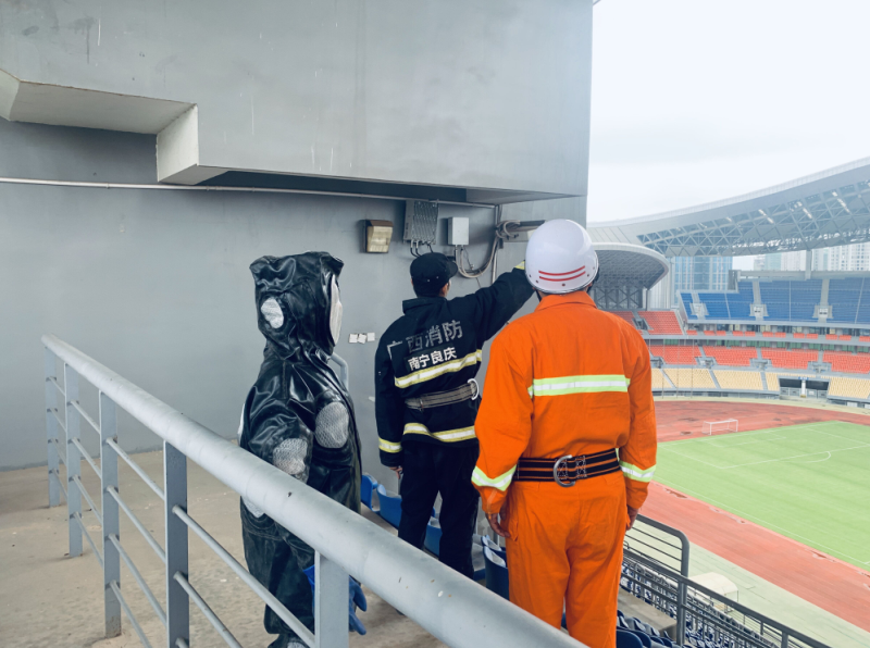 近日,C7(中国)文体公司管理人员在主体育场A区五层发现一个直径大约70厘米的马蜂窝,不时有马蜂飞来飞去,为防止马蜂伤人,文体公司联系良庆消防救援大队,请求支援帮助。