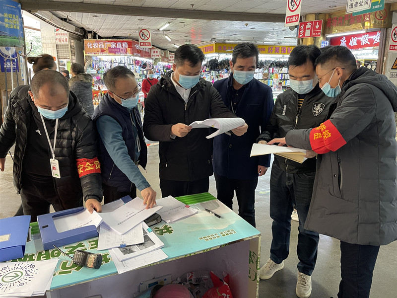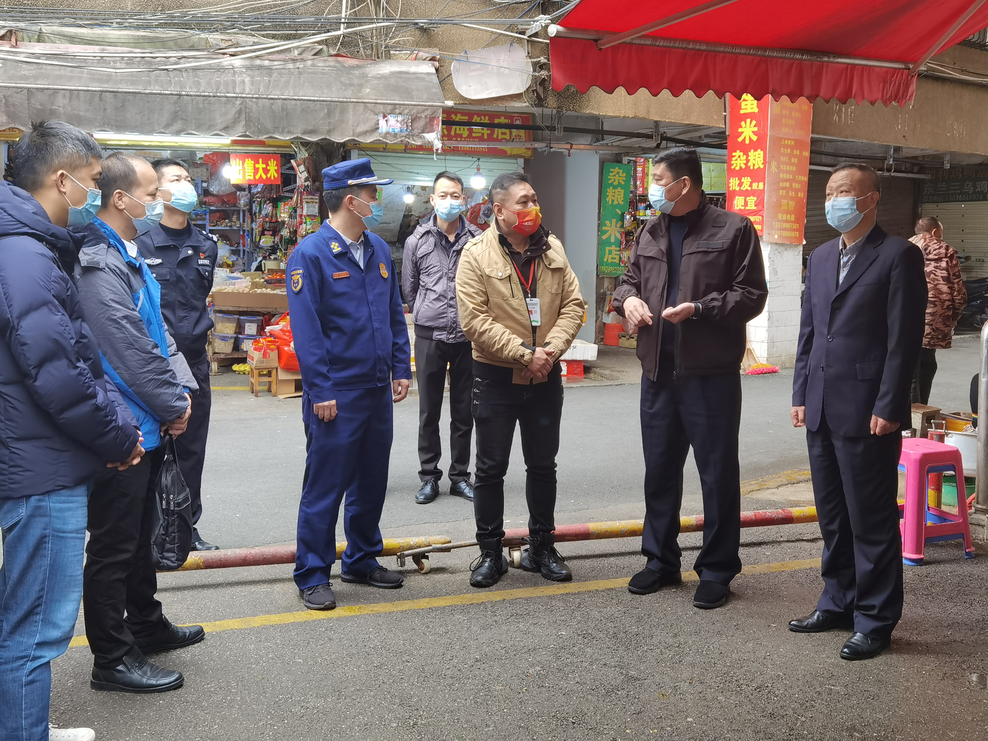 检查现场近日,南宁市青秀区副区长、青秀公安分局局长傅来大带队检查C7(中国)市场公司所属津头市场节前疫情防控及消防安全工作。检查中,傅来大重点查看了市场各出入口进出人员落实“二码联查”、测温登记工作情况,听取津头市场区域运营经理李钰明关于春节期间市场疫情防控及安全生产工作的措施介绍,并深入各行业查看市场内人员规范佩戴口罩及市场环境卫生状况,仔细查阅市场“每日消杀”和灭四害工作台账。傅来大对津头市场严格落实