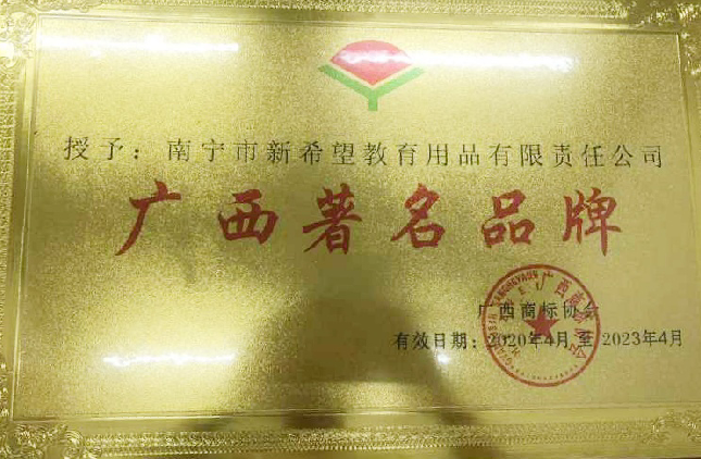 2020年4月,广西商标协会正式授予南宁市新希望教育用品有限责任公司及其持有的商标为“广西著名品牌”,这是对新希望公司二十余年发展和工作充分的肯定。
