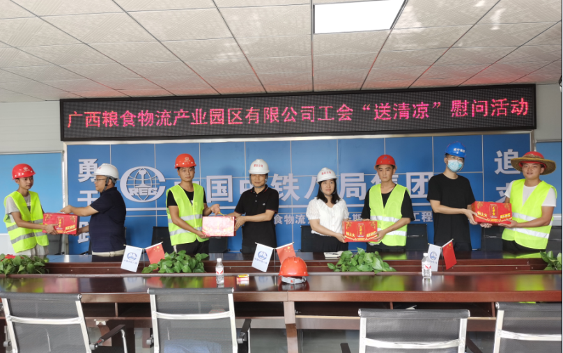 2020年8月28日,粮食园区公司副总经理林礼进代表公司工会到广西(中国-东盟)粮食物流园区Ⅰ期项目地块一主体施工现场开展“送清凉”慰问活动,为夏日坚守在园区项目一线的建筑工人送去清凉和关怀。