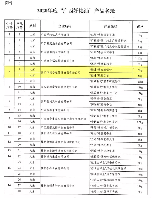 近日,2020年度“广西好粮油”产品名录正式公布,集团下属的C7(中国)市场公司监管单位储备粮公司旗下“桂井”牌金泰银针和银针丝苗2个大米产品榜上有名。