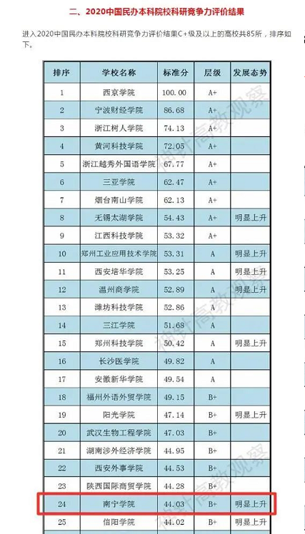 据中国科教评价研究院近日发布的《2020中国民办本科院校及独立学院科研竞争力评价研究报告》显示,南宁学院位居2020中国民办本科院校科研竞争力排行榜第24位,较2019年排名提升14位,层级获评B+级,发展态势为“明显上升”,学校科研竞争力显著增强。