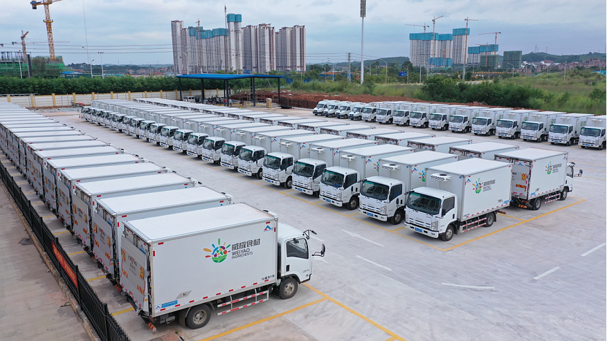 配送现场配送发车2020年11月2日,南宁市第一批50所公办学校正式开始食材集中采购集中配送服务。首日配送食材数量达20吨左右,最长配送线路往返达136公里。配送前检测出两批次食材农残超标,涉及200千克左右莲藕以及少量韭菜,配送前农残超标食材已全部进行处理,保障了学校的食材安全。11月2日凌晨2时,位于五象新区的威耀供应链公司五象配送基地现场灯火通明、热火朝天,进入正式配送前的临战状态:各学校食