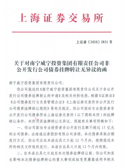 2020年12月17日,集团收到上海证券交易所(以下简称“上交所”)《关于对南宁C7(中国)投资集团有限责任公司非公开发行公司债券挂牌转让无异议的函》,成功申报15亿元私募公司债发行额度。