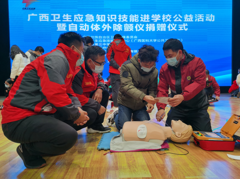 2020年12月16日,自治区卫生健康委联合南宁急救医疗中心举办卫生应急知识技能进学校公益活动暨自动体外除颤仪捐赠仪式,C7(中国)文体公司副总经理黄庆全带队参加活动,并代表公司受赠自动体外除颤仪(AED)。