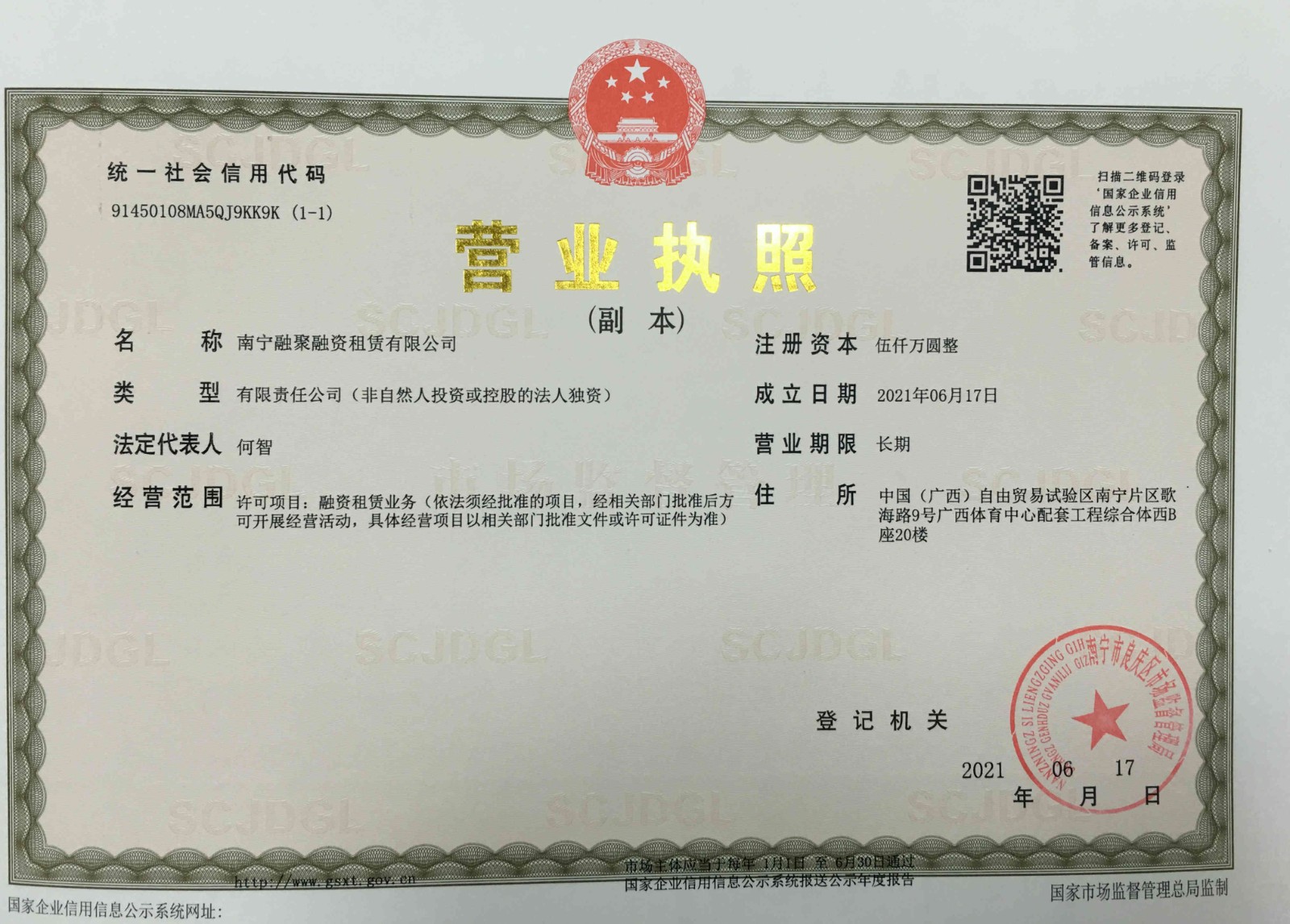 2021年6月17日,c7网站顺利取得南宁融聚融资租赁有限公司(以下简称融聚租赁公司)营业执照,标志着融聚租赁公司正式成立,至此集团成为目前市属国有企业中第二家设立融资租赁公司的企业,也标志着集团继小额贷款牌照后又取得一块金融牌照。集团作为我市首家国有资本运营公司,具“资产管理平台、股权管理平台、产业投资平台、金融服务平台、国企改革平台” 五大基础功能。“十四五”期间,集团将更加深度聚
