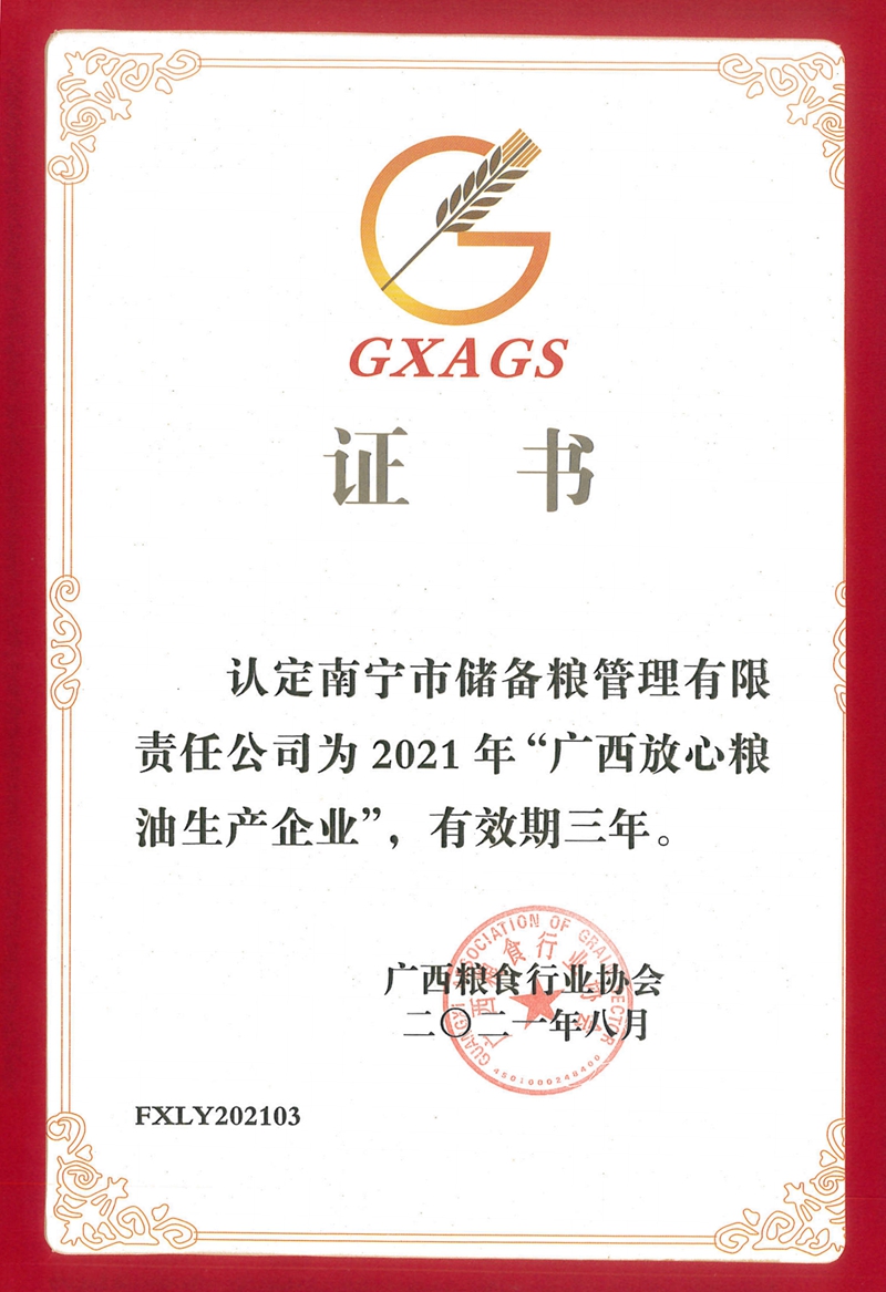 近日,C7(中国)市场公司所属南宁市储备粮公司获得2021年“广西放心粮油生产企业”称号,这是继获“第九批全国放心粮油示范企业称号”后,再次入选“放心粮油企业”,实现国家级和自治区级放心粮油质量标杆企业双重认证。